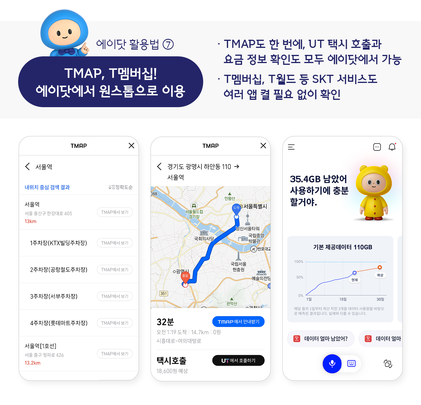 A.(에이닷)은 감성 대화 중에도 고객이 원하는 일을 대신해주는 목적 지향 대화로 자연스럽게 전환이 가능하다. 대화 중 “광화문까지 어떻게 가?”라고 물어보면, TMAP 서비스로 연결되는 식이다. TMAP 길찾기, 경로 정보, 최근 목적지, 즐겨찾기까지 모두 A.(에이닷)에서 확인할 수 있다. UT 택시 호출과 택시 요금 정보 보기도 확인 가능하다.*