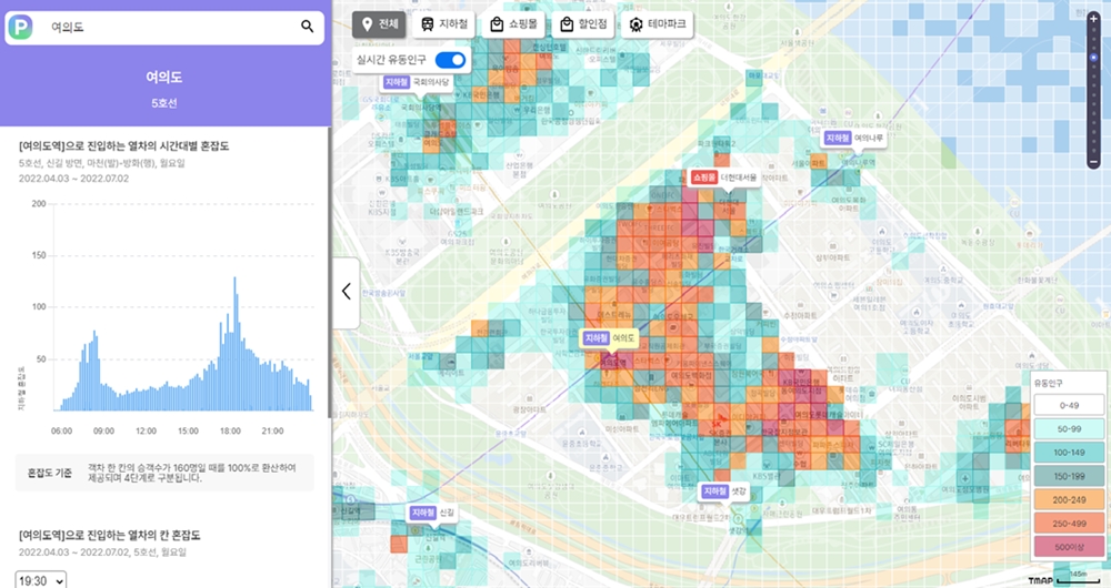 ‘지도 뷰’는 실시간 유동인구 데이터를 기반으로 지도 상에 격자 형태로 혼잡도를 보여주며 특히 백화점, 지하철, 쇼핑센터, 테마파크 등 특정 건물이나 위치의 혼잡도와 관련된 통계 데이터도 제공한다.