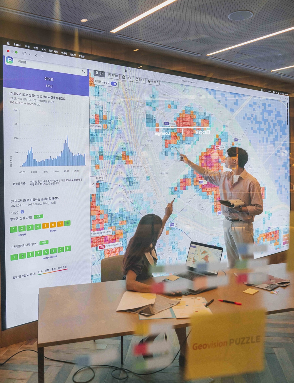 ‘지오비전 퍼즐’은 ▲지도를 기반으로 백화점, 지하철 등 주요 지역의 실시간 혼잡도를 한 눈에 볼 수 있는 ‘지도 뷰’와 ▲기지국 기반의 위치 데이터를 활용해 특정 지역의 유동인구, 지하철 혼잡도, 쇼핑 및 여가 장소 혼잡도, 국내 여행 인기 방문지, 주거 생활 분석 정보, 공유 킥보드 이용 데이터 등을 제공하는 ‘데이터 카탈로그’로 구성되어 있다.