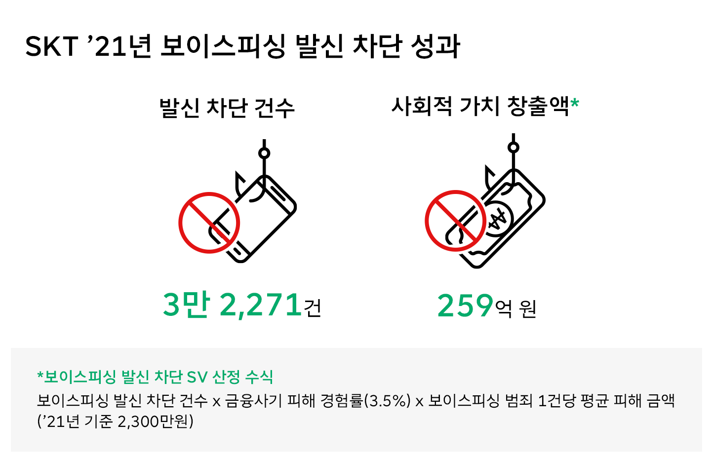 SKT는 ‘보이스피싱 발신 차단 서비스’를 통해 2021년 한 해 동안 3만 2,271건의 보이스피싱 전화연결을 차단해 고객의 소중한 재산을 보호했습니다. 보이스피싱 발신 차단 서비스는 경찰청 전국 신고번호 및 금융보안원 가로채기 번호에 대한 고객의 전화 연결 시도를 차단하는 서비스입니다. 범죄 번호로 고객이 전화연결을 시도하면 발신 차단과 함께 안내 멘트가 송출됩니다. SKT의 사회적 가치 측정 산식(SV)으로 환산하면 총 259억 원의 피해를 예방했습니다.