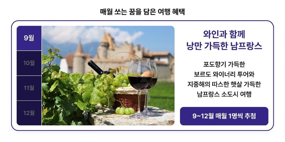 9월 추첨을 통해 증정될 여행 경품은 하나투어의 ‘와인의 성지, 보르도와 남프랑스’ 상품으로, 마르세유와 깐느, 생폴 드 방스 등 프랑스 남부 지역에서 와이너리 체험과 프랑스 가정식 등을 7박9일간 즐길 수 있다.