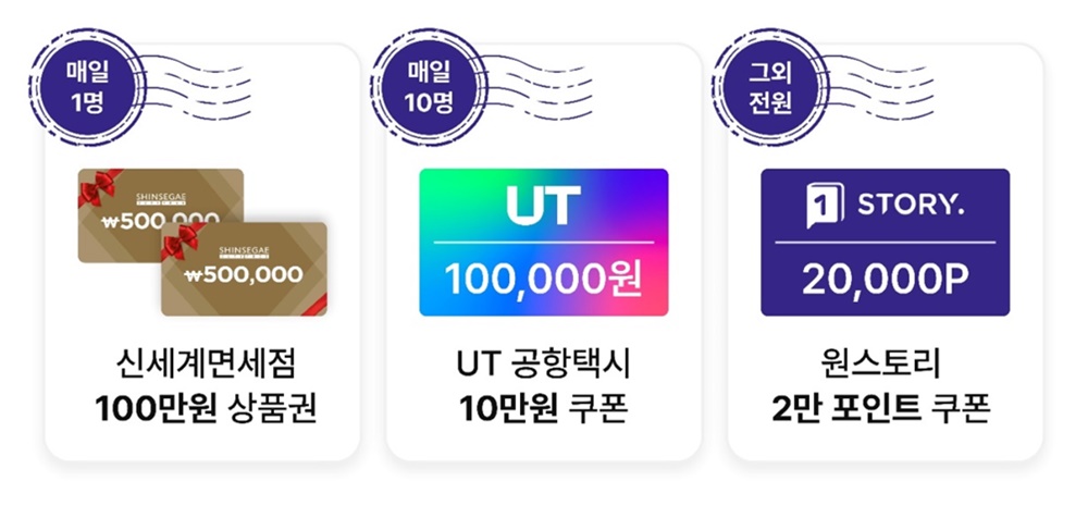 이 밖에도 같은 기간 매일 10명씩 총 1,080명에게 UT 공항택시 10만원 쿠폰을, 추첨 경품에 당첨되지 않더라도 응모자 전원에겐 원스토리 e-book 2만 포인트 쿠폰을 지급한다.