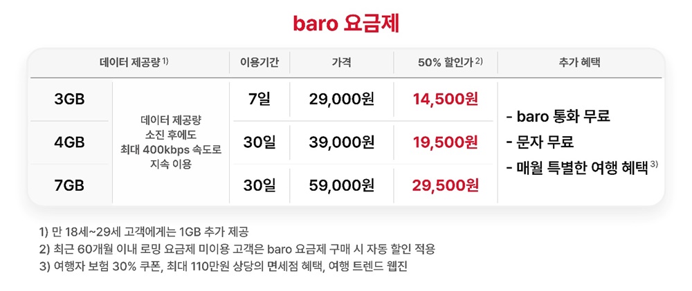 또한, baro 음성통화는 물론, 문자도 무료로 제공하고, 캐롯손해보험의 ‘해외 여행자 보험 30% 쿠폰(최대 1만원)’과 신세계면세점 최대 110만원 ‘면세점 혜택’, 하나투어 ‘여행 트렌드 웹진’ 등의 혜택도 제공 중이다.