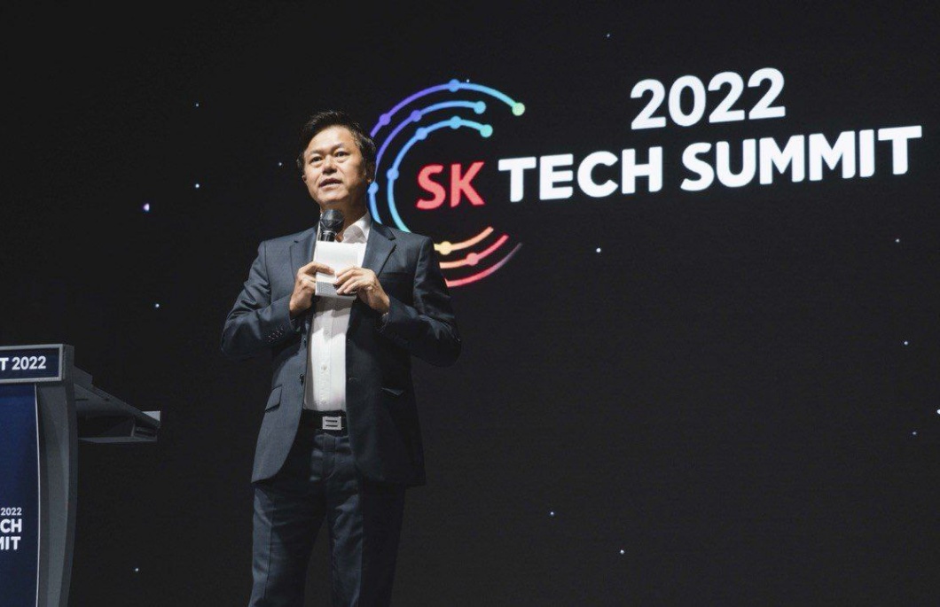 SK그룹 ICT위원장을 맡고 있는 박정호 SKT 부회장이 ‘SK 테크 서밋 2022’ 현장에서 환영사를 하고 있는 모습