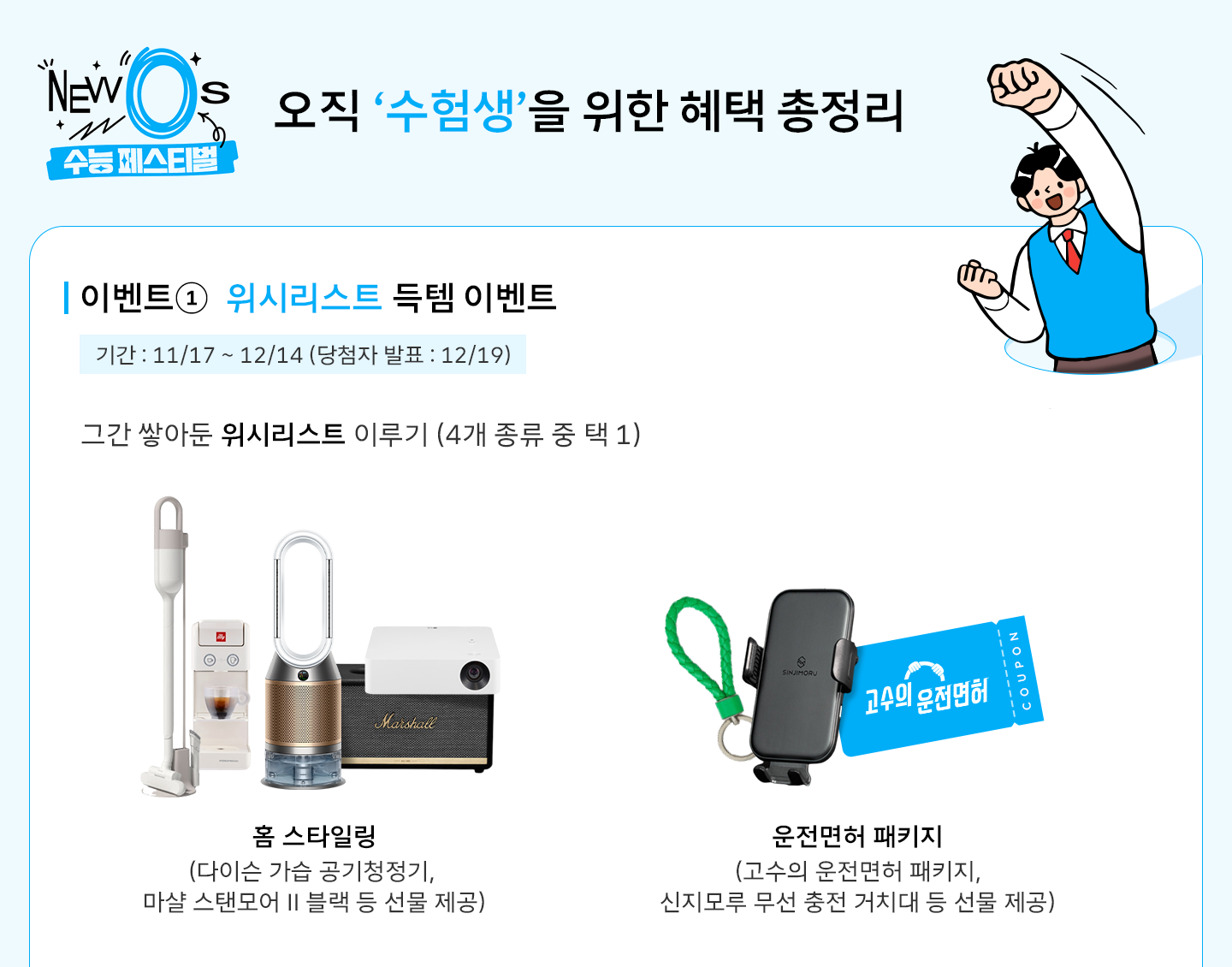 SKT는 수험생들이 지난 1년간 쌓아 뒀을 위시리스트를 이룰 수 있는 이벤트로 ‘수험생 누구나 위시리스트 득템 이벤트’를 준비했다. 최대 300만 원 상당의 파격적인 상품으로 구성된 러키드로우 이벤트로 홈 스타일링(5명), 운전면허 패키지(10명), 졸업여행 패키지(10명), 패션 메이크오버(25명) 네 가지의 위시리스트 중 하나를 골라 응모할 수 있으며, 총 50명을 추첨한다. 응모 기간은 11월 17일(목)부터 12월 14일(수)까지이다. 공식 웹사이트 T월드 내 수능 이벤트 페이지에서 SKT 고객 중 ’03, ’04년생은 누구나 응모할 수 있다. 당첨자 발표는 12월 19일(월)이다.