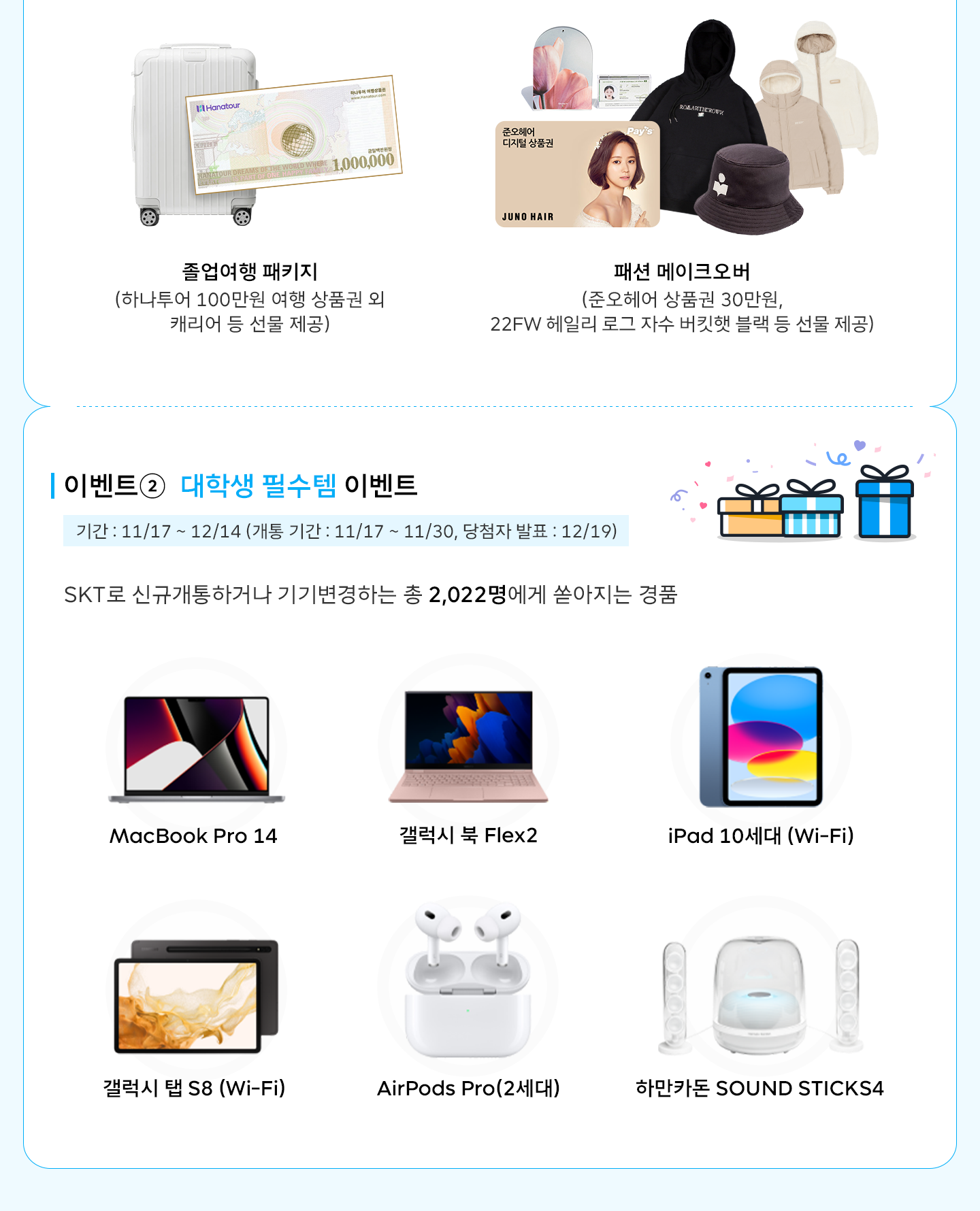 신학기를 맞아 휴대폰을 구매하는 수험생 2,022명에게 경품을 주는 ‘대학생 필수템 이벤트’도 있다. 11월 17일(목)부터 11월 30일(수)까지 신규개통/기기변환을 하고 0한동 앱 내 수능 이벤트 페이지에 응모한 ’03, ‘04년생 고객 중 추첨을 통해 노트북(5명), 태블릿PC(7명), 음향기기(10명)와 교촌치킨 교환권(300명), 올리브영 3만 원 상품권(700명), 스타벅스 교환권(1,000명)을 제공한다.