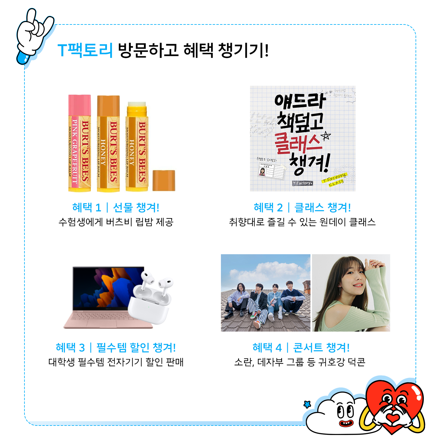 수능이 끝난 수험생은 T 팩토리에 마련된 다양한 혜택 또한 이용할 수 있다. T 팩토리를 방문해 수험표를 제시하면 받을 수 있는 버츠비 립밤 이벤트와 대학 신입생에게 필요한 기기들을 할인된 금액으로 구매할 수 있는 이벤트를 포함해, 3개의 원데이 클래스도 준비되어 있다. 11월 25일(금)부터 11월 28일(월)까지는 1년간의 수험 스트레스를 날려줄 수험생 대상 무료 이벤트인 덕콘이 예정되어 있다. 해당 콘서트에는 소란, 데자부 그룹, 주만, 치즈 등 10대들이 좋아하는 가수들이 출연할 예정이며, 11월 17일(목)부터 T 팩토리 홈페이지에서 신청할 수 있다.