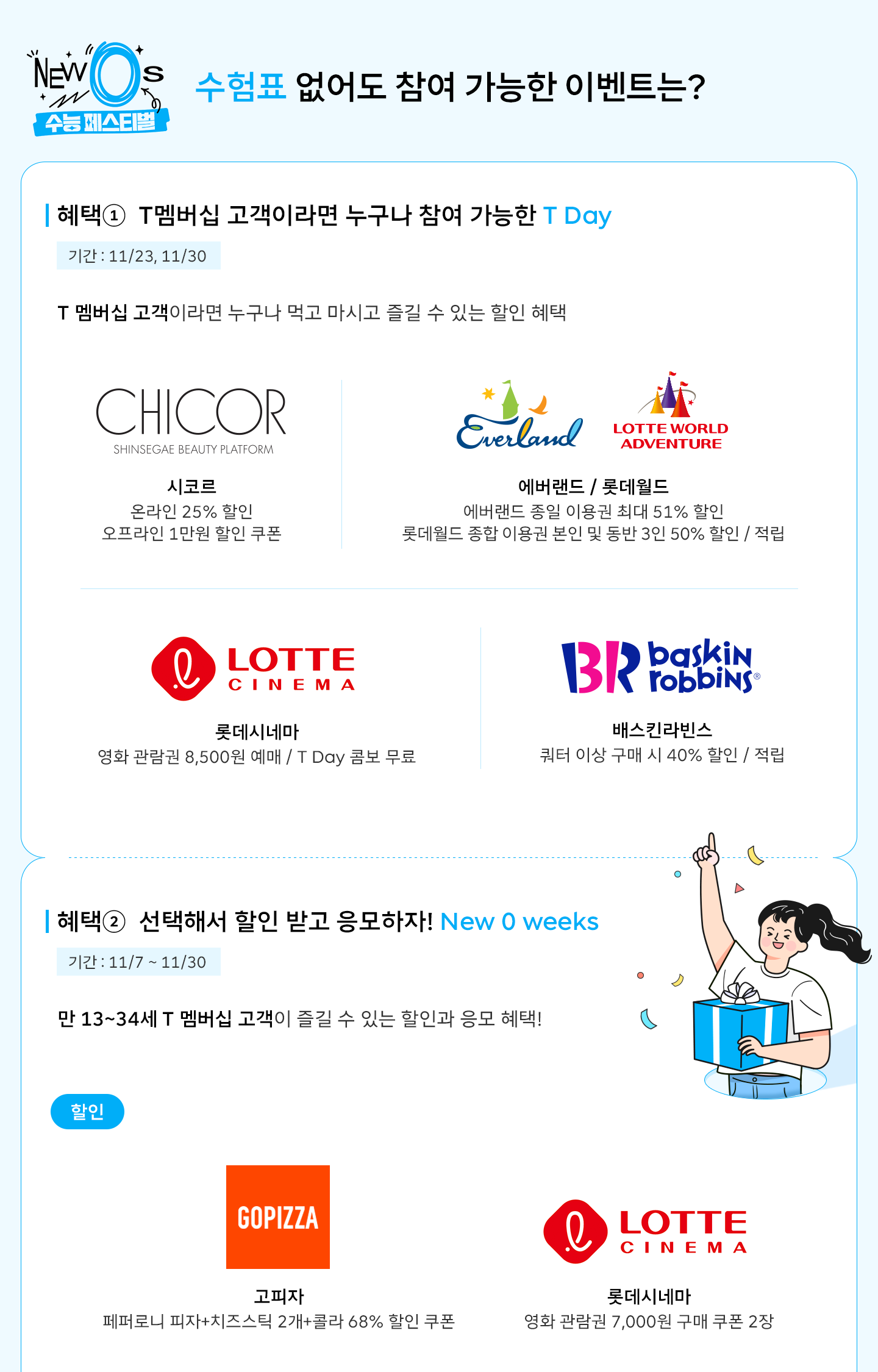 수험표가 없는 고객이라도 수험생과 함께 즐길 수 있는 혜택 또한 준비되어 있다. T 멤버십 고객이라면 11월 23일(수)과 11월 30일(수)인 T day에 시코르와 롯데시네마, 에버랜드, 롯데월드, 배스킨라빈스에서 다양한 할인 혜택을 받을 수 있다.