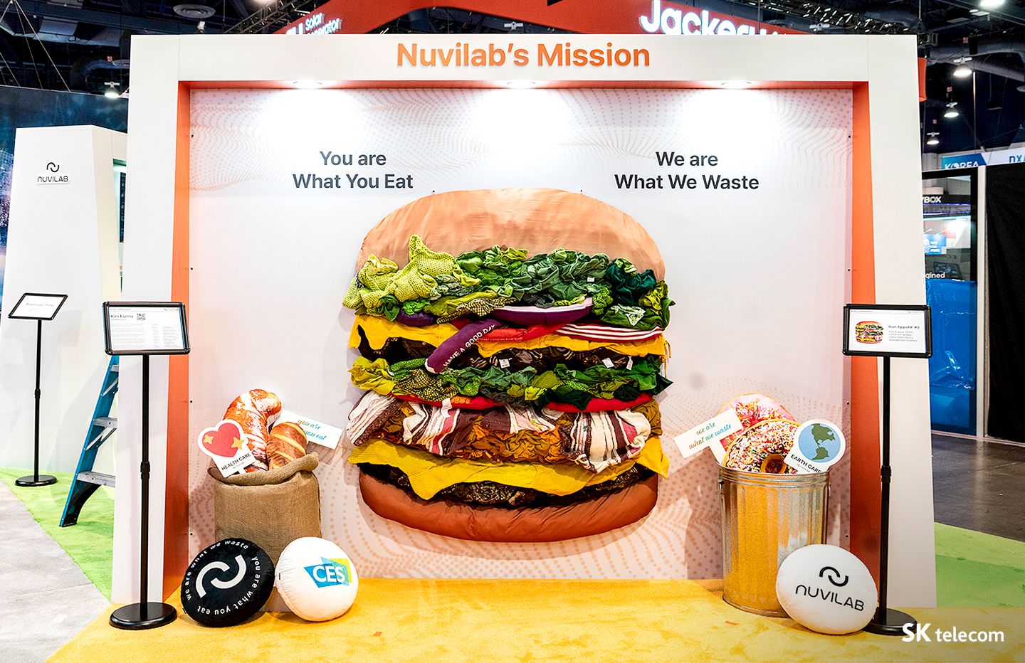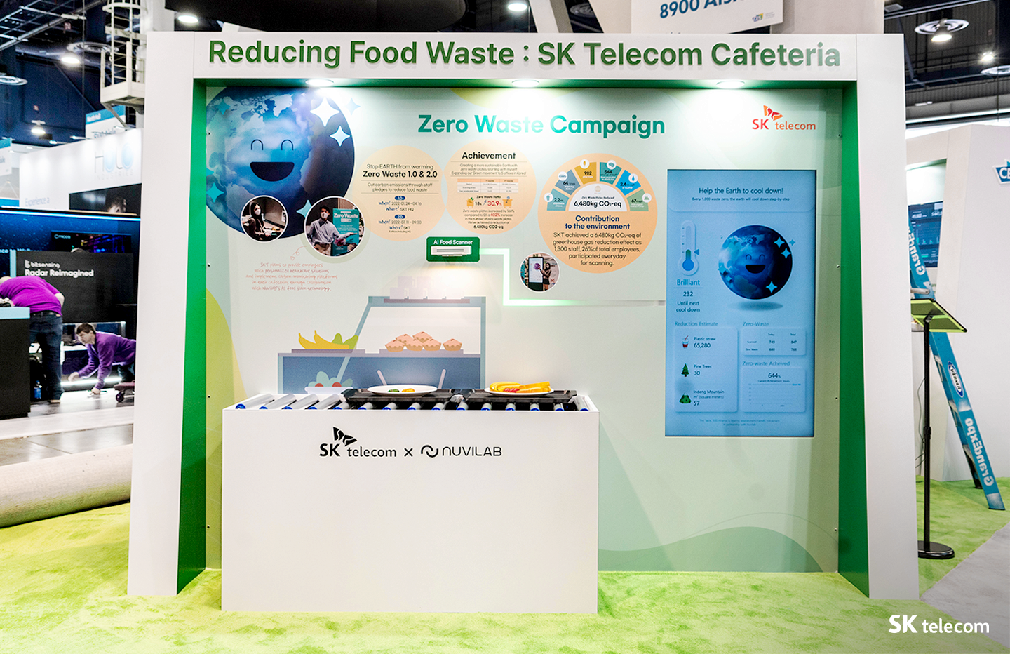 Sustainability zone에서는 누비랩과 SKT가 함께 진행한 ‘Zero Waste(잔반 없애기)’ 캠페인이 소개됐습니다. 따로 나뉘어 진행된 Zero Waste 1.0과 Waste 2.0의 결과, 총 1,300명 인원이 동참해 누적 6,480kg CO₂-eq의 탄소 저감을 달성했습니다. 그와 함께 누비랩의 AI 푸드 스캐너는 ESG 경영이 전 세계적인 중요 과제로 떠오른 현재, 기업의 환경에 대한 명확한 지표 제공에 도움을 줄 수 있는 기술로 기대되고 있습니다.