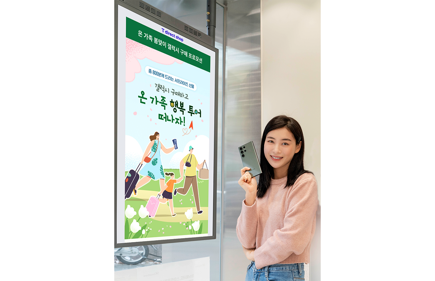 SK텔레콤 홍보모델이 T다이렉트샵에서 진행하는 봄맞이 스마트폰 구매 프로모션을 소개하고 있다. 14일부터 28일까지 T다이렉트샵에서 갤럭시S23, 갤럭시S22, 갤럭시 Z 시리즈, 갤럭시 퀀텀3 등을 구매 및 개통한 후 이벤트 페이지에 응모하면 200만원 상당 여행상품권, 리모와 캐리어, 롯데월드 종일이용권 등 경품을 제공한다.