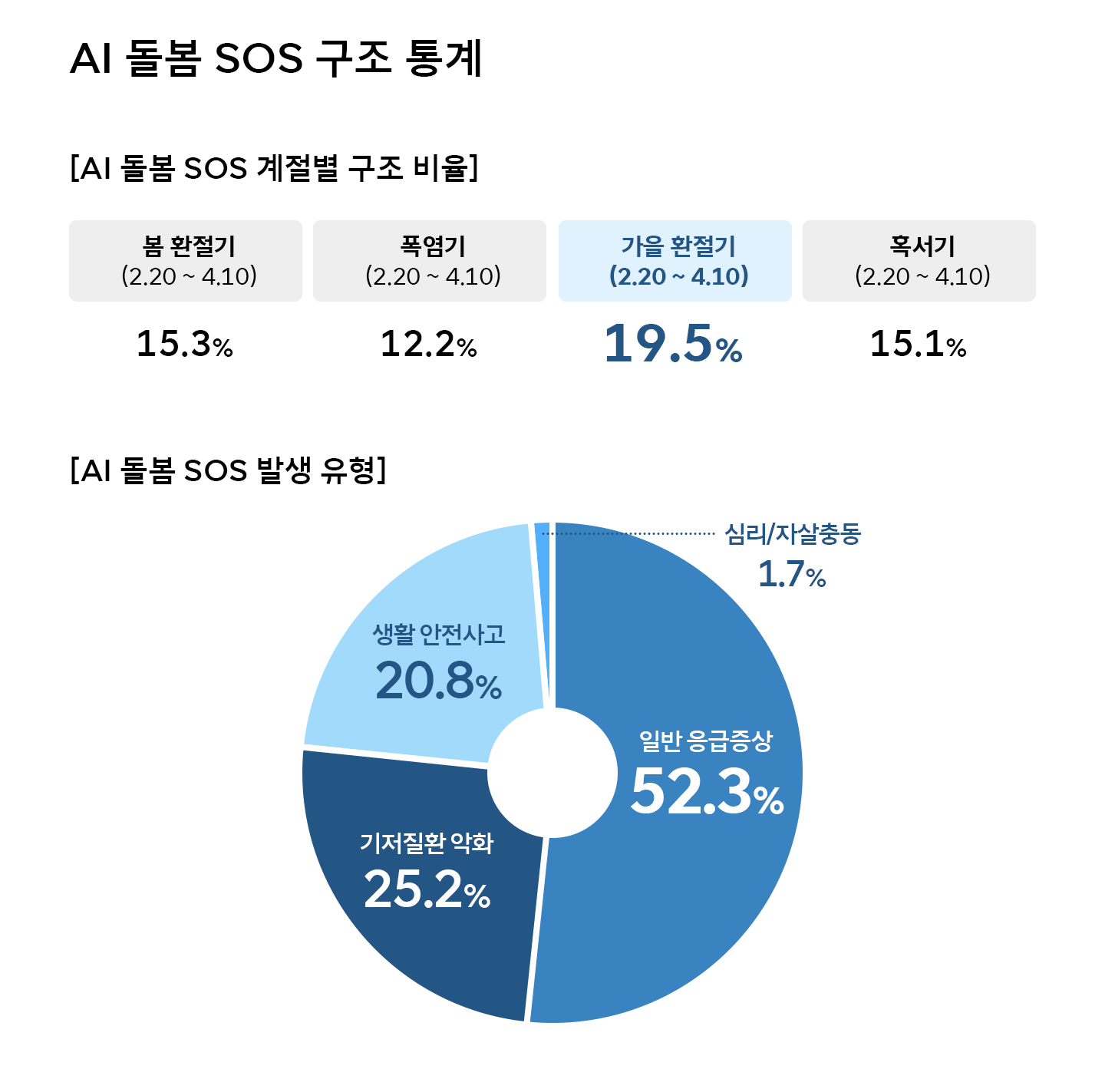 2019년 4월 AI 돌봄 긴급 SOS 구조 서비스가 시작한 이후 2023년 5월 7일까지 500건의 구조 사례가 발생했습니다. 2023년 1월 70대 어르신은 허리가 아프고 다리에 마비가 오는 것 같다며 긴급 SOS를 통해 도움을 요청해 응급실로 이송하여 수술을 진행했습니다. 집안에서 넘어져 허리를 다친 80대 어르신은 통화가 어려워 긴급 SOS로 신고, 척추뼈 골절 치료를 받을 수 있었습니다.