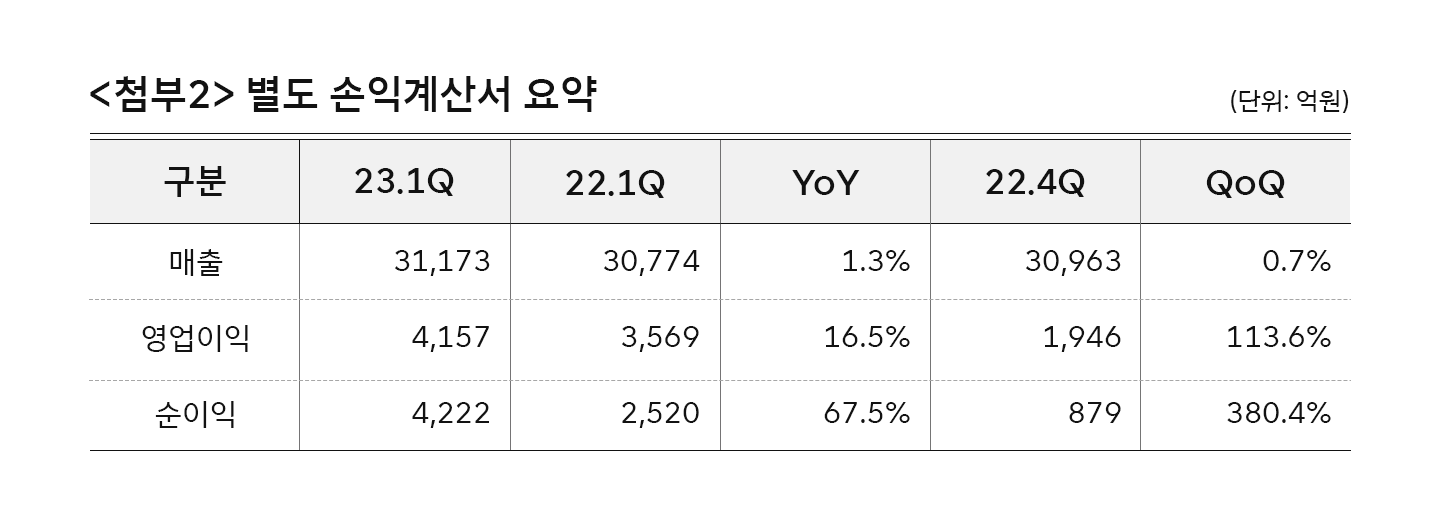 SKT는 별도 재무제표 기준 2023년 1분기 매출 3조 1,173억원, 영업이익 4,157억원을 기록하며 전년 동기 대비 각각 1.3%, 16.5% 성장했다.