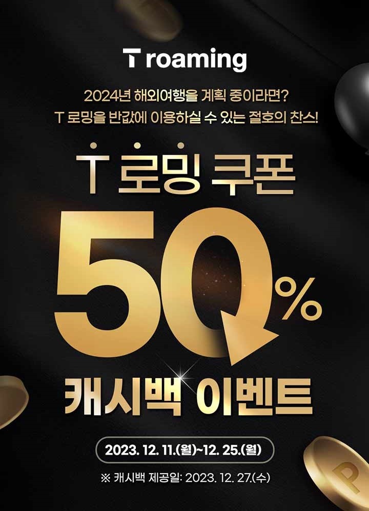 또 SKT는 내년 해외여행을 계획하는 고객들을 위해 12월 11일부터 25일까지15일간 T 로밍 쿠폰 구매 고객에게 구매 금액의50%를 네이버 포인트로 돌려주는 ‘캐시백 이벤트’도 연다.