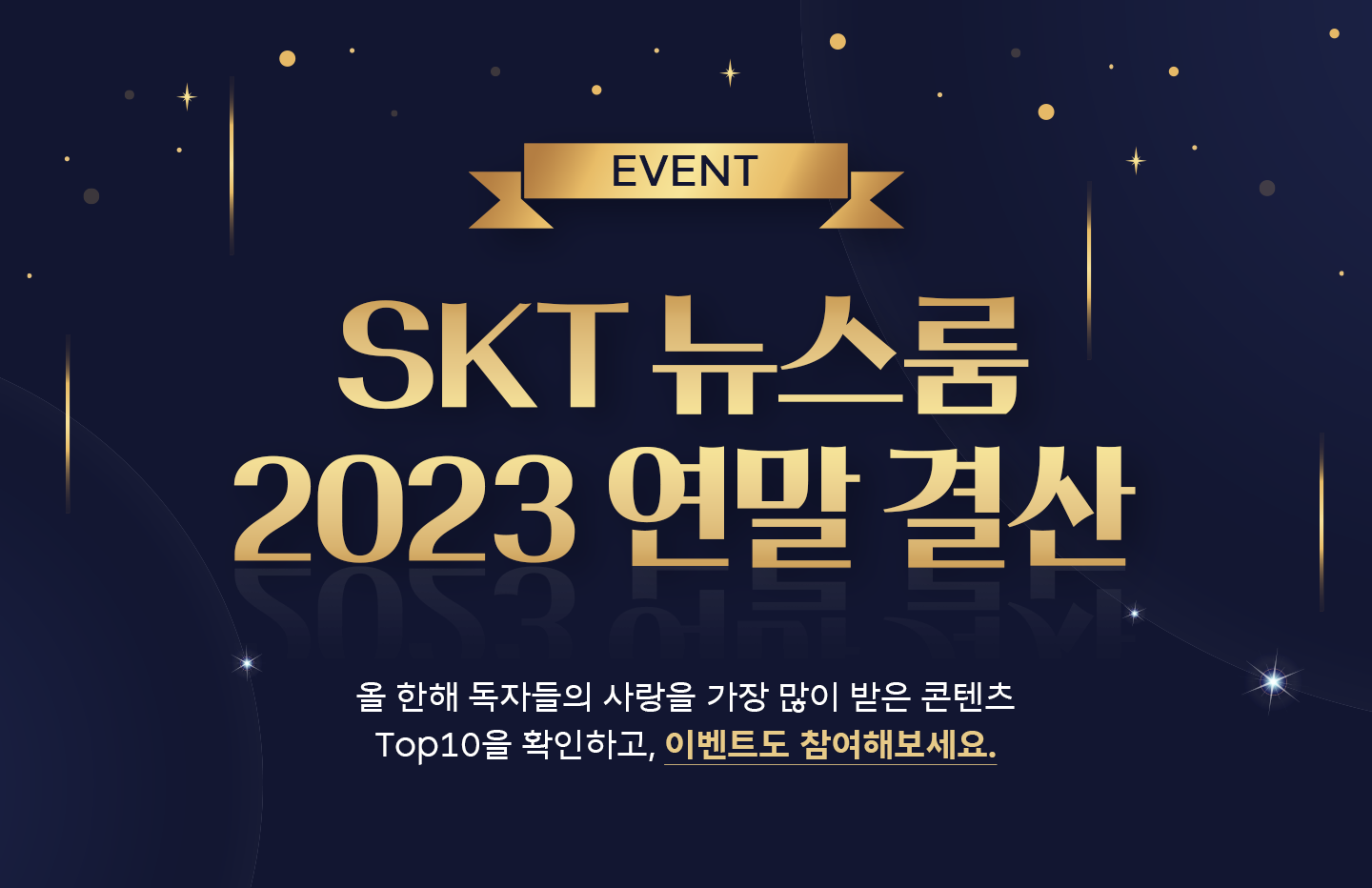 SK텔레콤 뉴스룸에서 얼마 남지 않은 올해를 마무리하며, <2023년 독자들에게 가장 사랑받은 뉴스룸 콘텐츠 Top 10(조회수 Top 10*)>을 정리했다. 올 한 해 뉴스룸을 찾아준 분들을 위한 이벤트도 준비했으니 많은 참여를 부탁드린다.