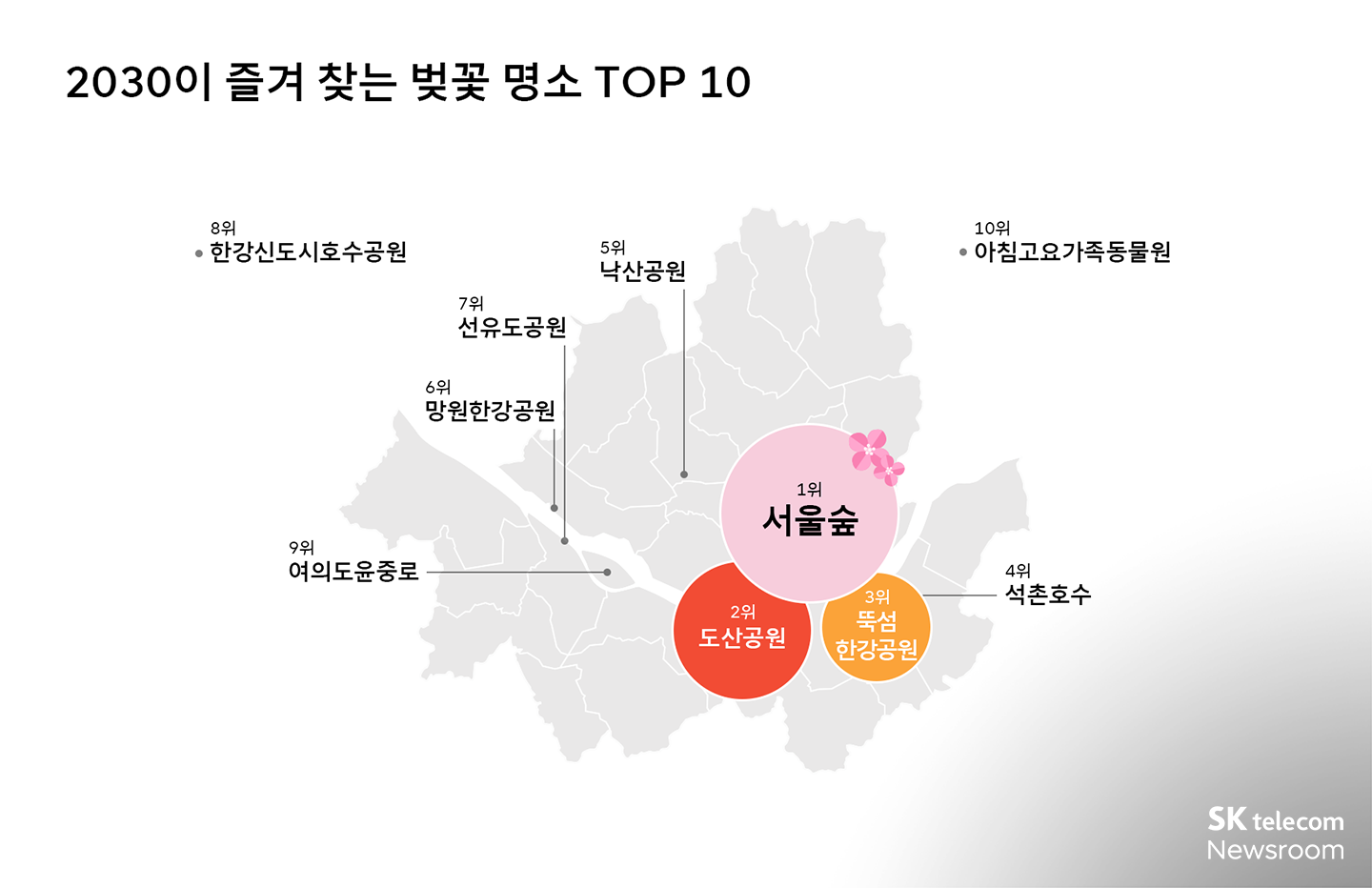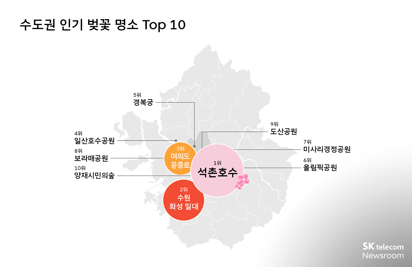 SKT는 빅데이터 분석 서비스인 지오비전 퍼즐(PUZZLE)을 통해 수도권 벚꽃 명소 순위를 공개했다. 가장 인기 있는 수도권 벚꽃 나들이 장소는 석촌호수, 수원화성일대, 여의도윤중로 순으로 나타났다. 20, 30대 방문율이 높은 장소는 서울숲으로 나타났다. [보러가기]