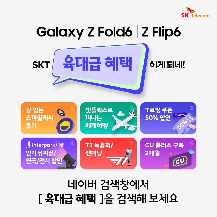 한편, SKT에서 갤럭시 Z 폴드6·플립6를 개통하는 고객들은 SKT가 준비한 6가지 ‘육대급(6가지 역대급) 혜택’ 프로모션을 통해 다양한 혜택을 누릴 수 있다.