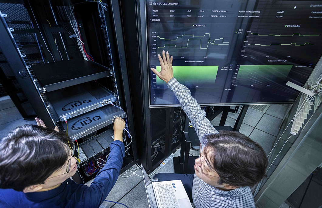 SK텔레콤이 양자암호 양대 기술로 평가되는 최신의 PQC 표준 알고리즘과 기존의QKD 시스템을 결합한 ‘QKD-PQC 하이브리드형 양자암호’ 제품을 출시했다고 15일 밝혔다. SKT와 QKD 제품 보유기업인 아이디퀀티크(IDQ) 구성원들이 해당 제품을 테스트하는 모습.