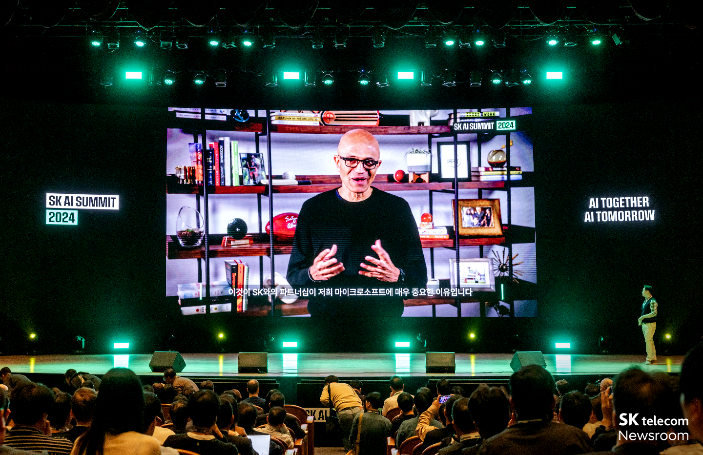 Satya Nadella MS 회장이 영상을 통해 SK AI SUMMIT 2024 개최에 대한 축하인사를 전하고 있다.