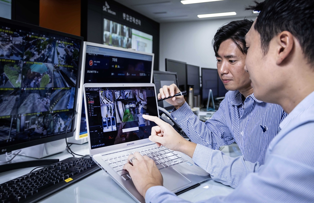 ‘AI 영상 관제’는 AI CCTV, 드론, 바디캠 등의 디바이스로 촬영한 영상을 AI로 분석해 보안 위협과 사고 상황을 감지하는 솔루션이다. SKT의 영상 분석 AI 기술을 활용해 외부인의 침입, 작업자의 낙상, 공장 화재 등의 사고를 즉시 파악하고, 관리자에게 전달해 초동 조치를 위한 골든 타임을 확보할 수 있다. 특히, 서버에 전달되는 영상을 AI로 분석하기 때문에 기존 CCTV를 교체하지 않아도 솔루션을 이용할 수 있어 비용 절감이 가능하다.