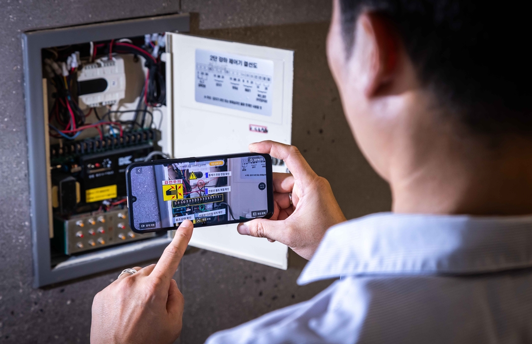 AR·VR 안전 교육 – 현장 작업자의 스마트폰에 증강하여(AR) 설비를 점검하는 모습