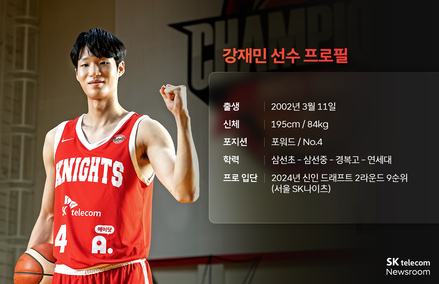 강재민 선수는 195cm라는 준수한 피지컬과 우수한 운동 능력을 갖춘 포워드이다. 큰 키에 비해 스피드가 뛰어나 SK나이츠의 달리는 농구 스타일에 잘 적응할 것으로 기대된다. 팀에서의 목표를 묻자, 그는 “팀의 에이스 역할을 하는 것도 좋지만, ‘이 선수는 꼭 필요한 선수다’라는 말을 듣는 선수가 되고 싶다”고 답변했다. 팬들에게 자신을 표현하는 한마디를 해달라는 요청에 ‘잠재력이 있는 선수’라고 답하며 “앞으로 보여줄 것이 많고, 그런 평가를 많이 받는 선수가 되겠다”며 당찬 포부를 밝혔다.