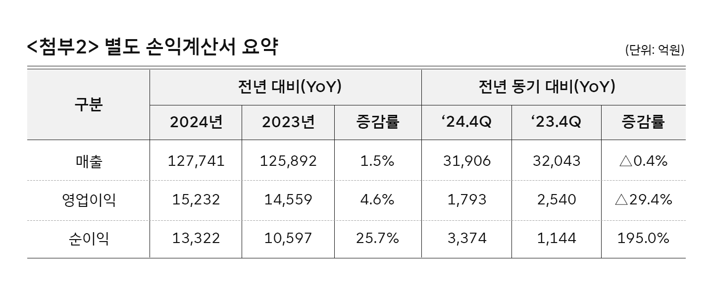 별도 기준 2024년 연간 매출은 12조 7,741억원, 영업이익 1조 5,232억원을 기록해 전년 대비 각각 1.5%, 4.6% 증가했다. 별도 순이익은 1조3,322억원이다.