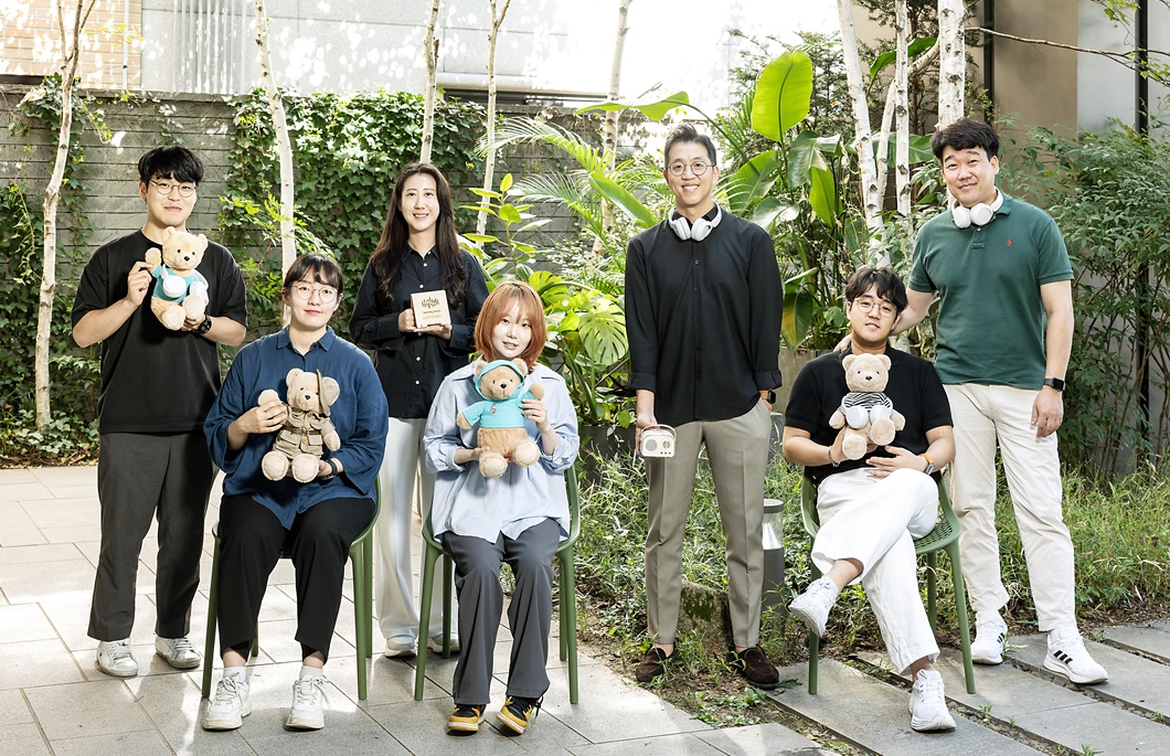 스트레스솔루션 배익렬 대표와 임직원이 전시에서 선보일 예정인 테디베어 수면 인형을 들고 포즈를 취하는 모습