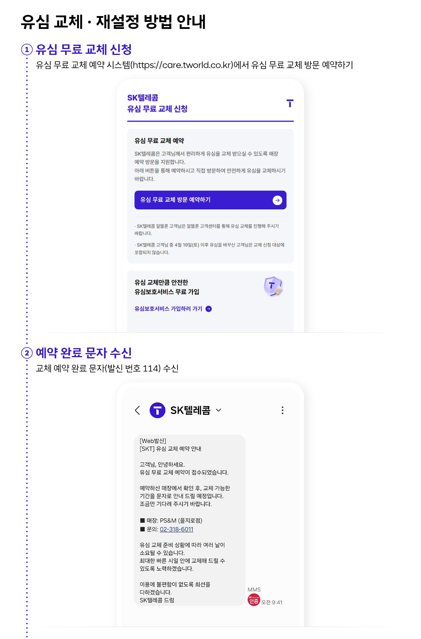 방문 고객은 물리적으로 유심을 새로 바꾸지 않아도 되는 ‘유심 재설정’을 이용할 수 있습니다. 유심 재설정은 기존 유심 내부의 일부 정보를 초기화해 새롭게 등록하는 방식으로, 유심을 실제로 교체하지 않아도 동일한 효과를 얻을 수 있습니다.