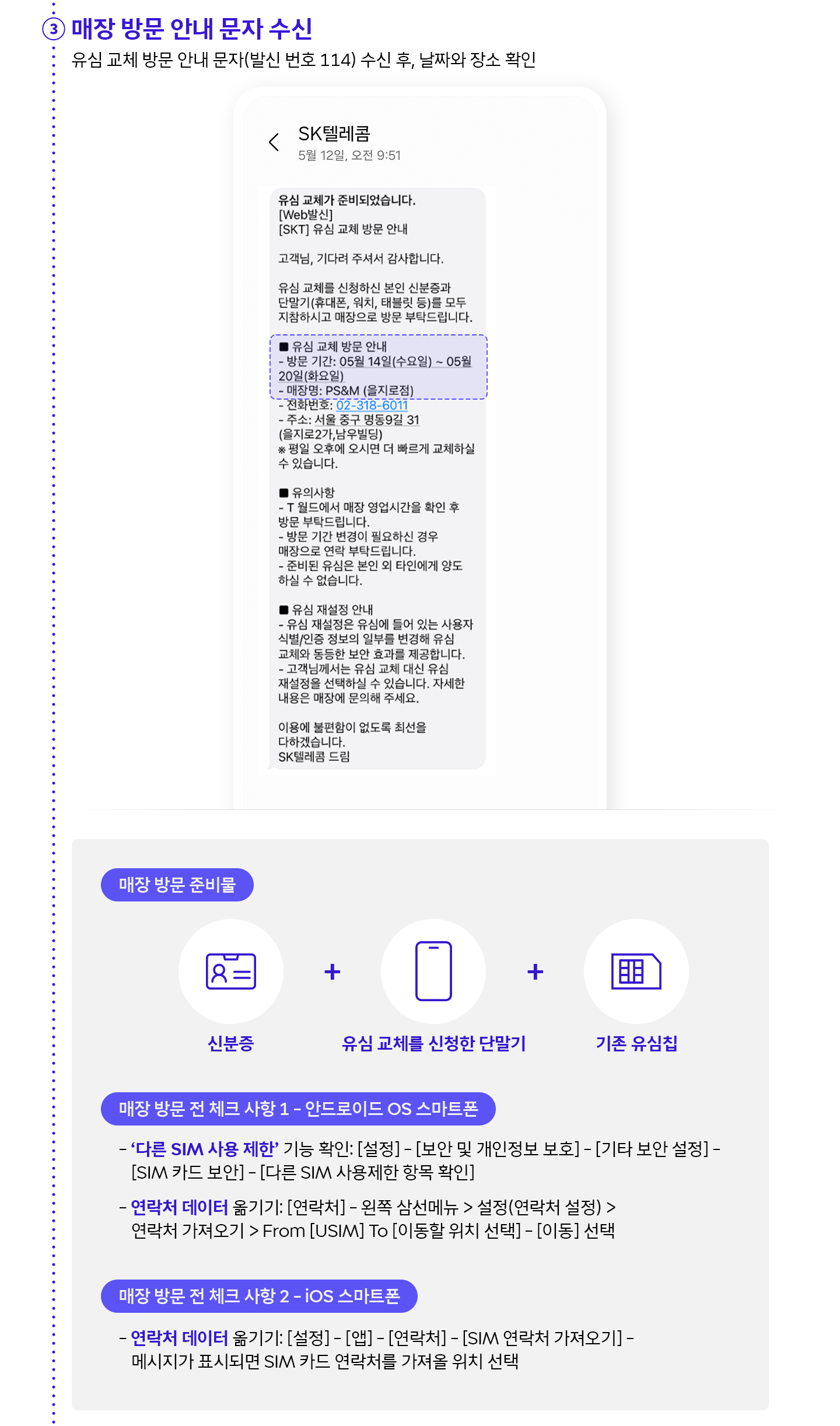 – iOS 스마트폰: [설정] – [앱] – [연락처] – [SIM 연락처 가져오기] – 메시지가 표시되면 SIM 카드 연락처를 가져올 위치 선택※ 단말기에 따라 경로가 다를 수 있으며, 위 경로로 확인되지 않을 경우 제조사에 문의해 주시기 바랍니다.