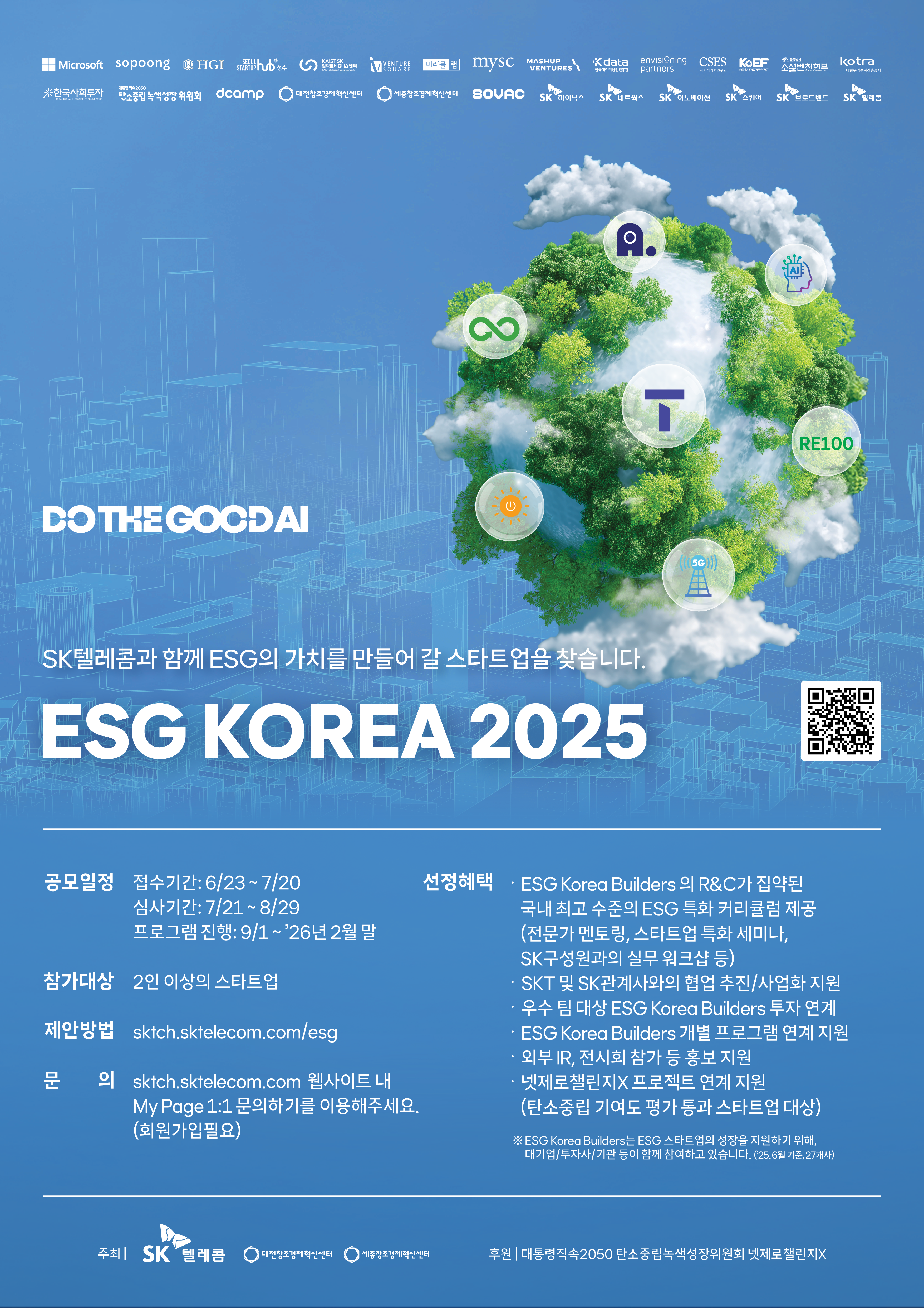 SK텔레콤이 주도하고, 국내외 스타트업 생태계의 주요 플레이어들이 함께하는 대한민국 대표 ESG 스타트업 육성 지원 프로그램 ‘ESG 코리아 2025(ESG KOREA 2025)’가 6월 23일부터 참가 모집을 시작했습니다. 올해 ‘ESG KOREA 2025’는 ‘DO THE GOOD AI’ 비전 아래 총 15개 팀이 선발될 예정이며, ESG 분야 스타트업과 SK그룹 관계사 간의 협업 강화, 정부 지원 프로그램 확대 등을 통해 스타트업의 실질적인 성장을 적극 지원할 계획입니다.