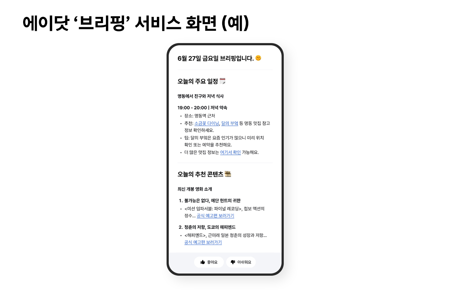 예를 들어, 하루를 시작할 때 ‘브리핑’ 서비스가 이용자의 정해진 일정에 따른 동선별 날씨나 관심사 기반의 콘텐츠를 추천한다.