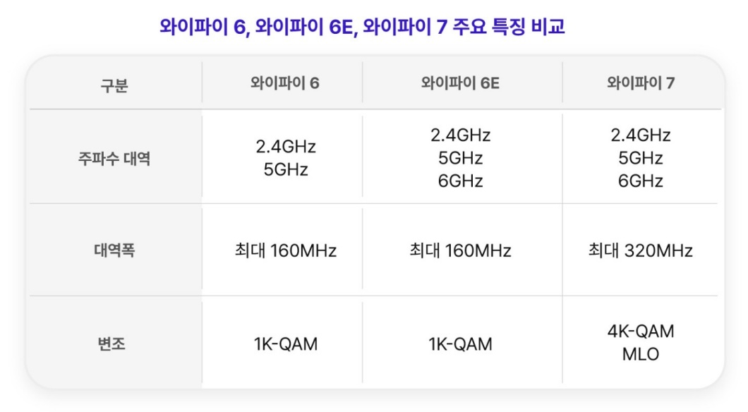 와이파이 7은 기존 와이파이 6∙6E에 비해 전송 속도가 빠르고 지연시간이 단축된다. 우선 와이파이 7은 2.4GHz, 5GHz, 6GHz 등 주파수 대역을 동시 지원해 더 많은 장치가 서로 간섭 없이 빠르게 통신할 수 있도록 해준다. 대역폭(채널폭)도 와이파이 6∙6E의 2배인 320MHz로, 한번에 처리할 수 있는 데이터 양이 늘어난다.