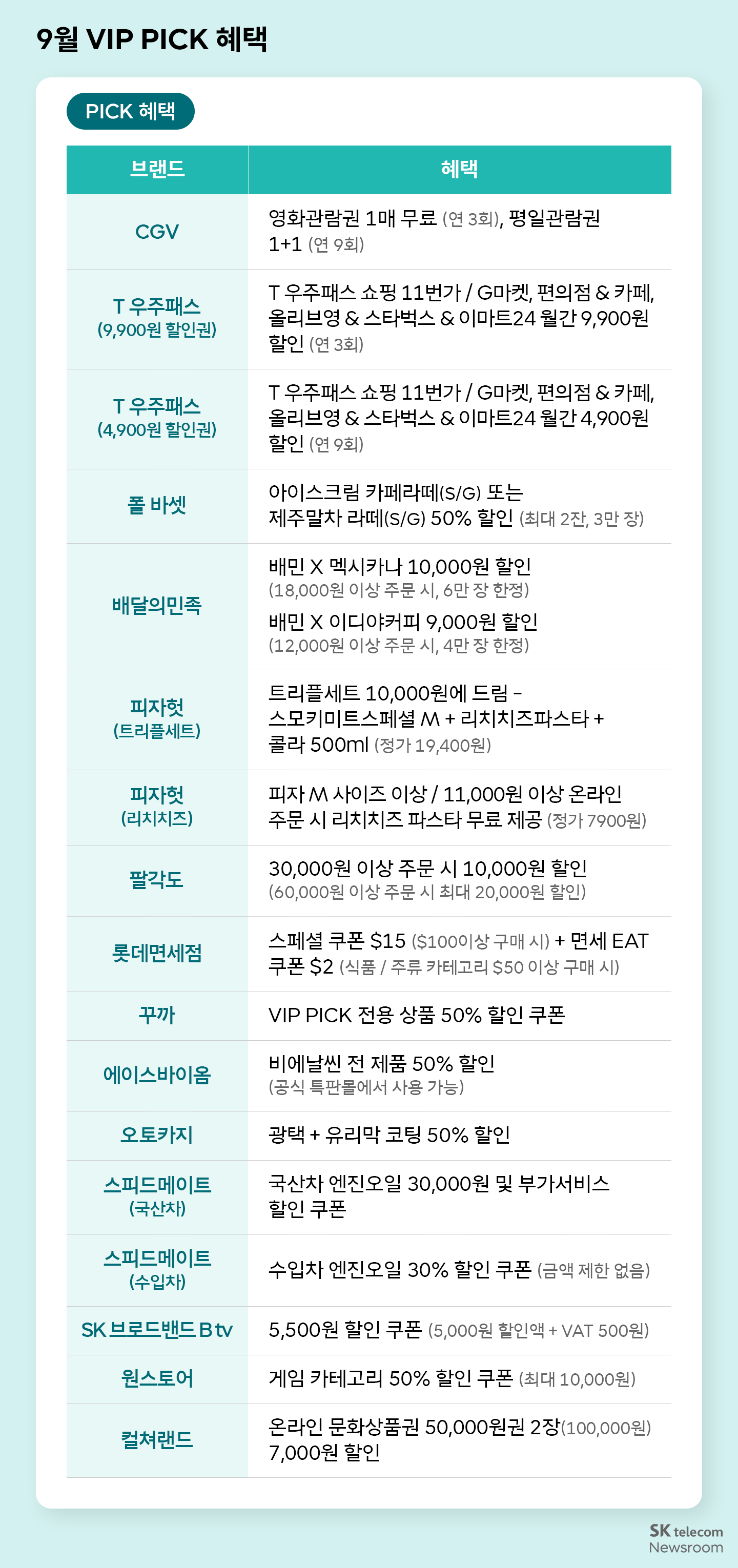 인기가 높은 배달의민족 할인권은 옵션을 두 가지로 늘리고, 발급 수량도 8월 5만 장에서 9월 10만 장으로 두 배 확대됐다. 또한 최근 출시된 ‘T 우주패스 올리브영&스타벅스&이마트24’ 상품도 VIP PICK 우주패스 할인 대상으로 적용됐다. 이 외에 폴바셋, 팔각도, 오토카지 등 신규 PICK 혜택이 추가돼 고객 선택 폭을 넓혔다.