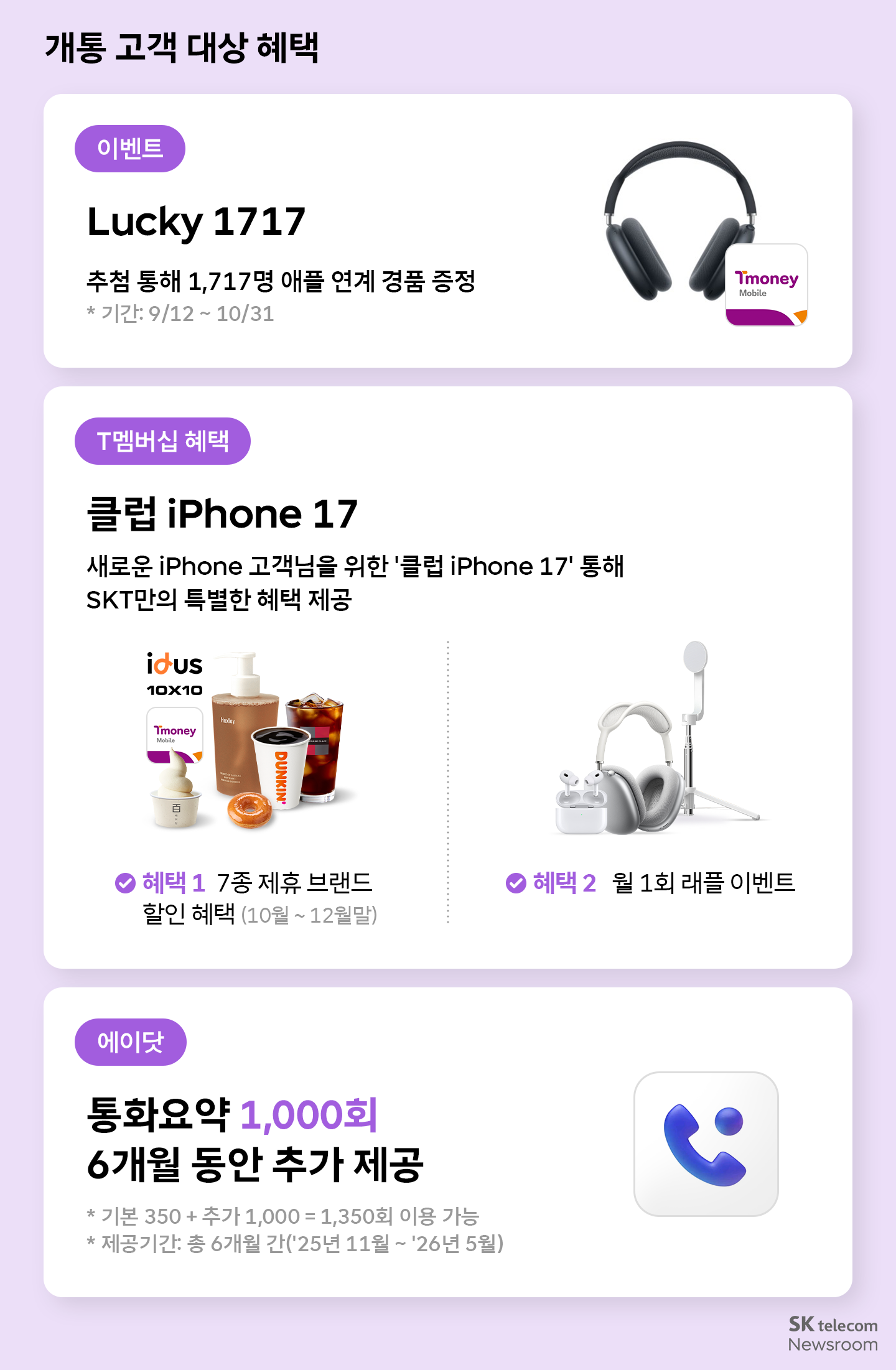 뿐만 아니라, SKT는 ‘클럽 iPhone 17’을 신설 운영해 새로운 iPhone을 구매한 고객에게 SKT만의 특별한 혜택을 제공한다. 투썸플레이스, 던킨, 백미당, 헉슬리 등 총 7종 제휴 브랜드 할인 혜택을 10월부터 12월 말까지 제공하고, 에어팟 맥스, 에어팟 프로2 등 래플 이벤트를 월 1회 연말까지 진행한다.