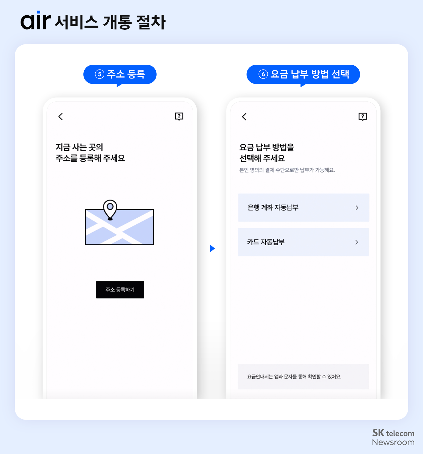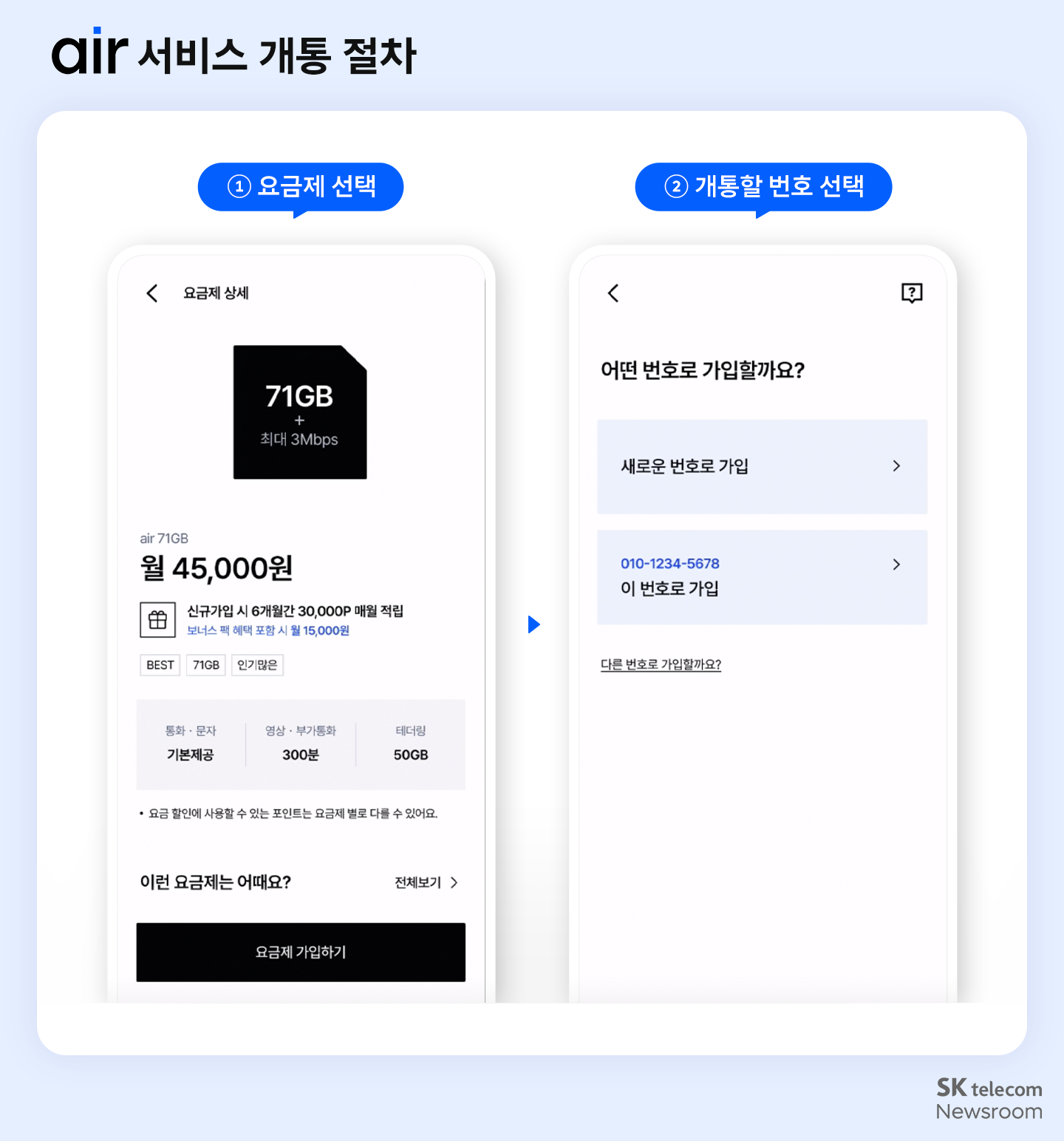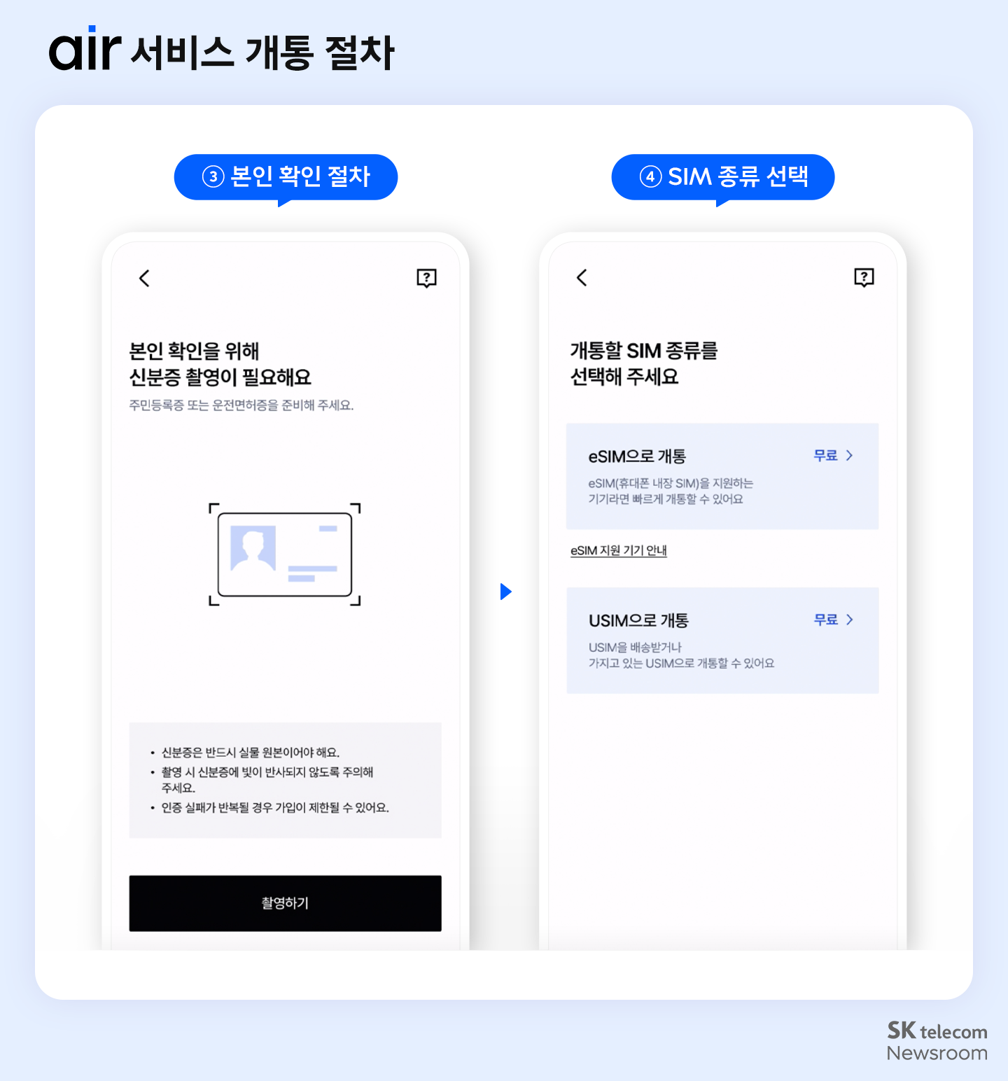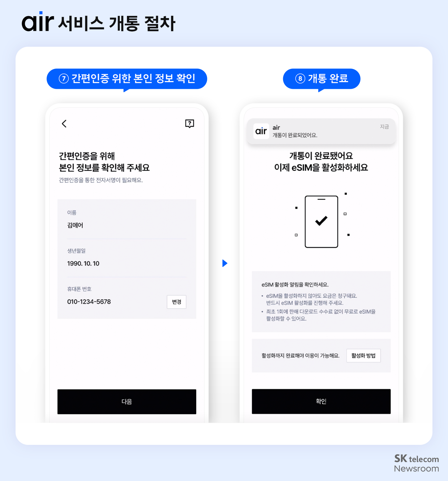 SKT는 회선 가입 단계에서 중복되거나 불필요한 단계를 줄이고, 고객이 에어 앱에서 쉽고 편리하게 셀프 개통과 해지를 할 수 있게 했다. 이심(eSIM)으로 개통 시 즉시 개통이 가능하며, 유심(USIM) 개통은 고객 상황에 맞춰 당일 퀵 배송, 당일 택배, 일반 택배 등 3가지 유심 배송 옵션 중 선택할 수 있다. 출시 기념으로 이심과 유심 발급 비용과 유심은 배송 비용 1회까지 무료 제공된다. 또한, 해피콜 없는 자동 유심 개통으로 빠른 셀프 개통을 지원한다. 주말, 밤 등 즉시 개통이 불가능한 시간대에는 예약 가입 기능을 통해 예약하면 개통 가능한 날 오전 9시에 자동 개통된다.