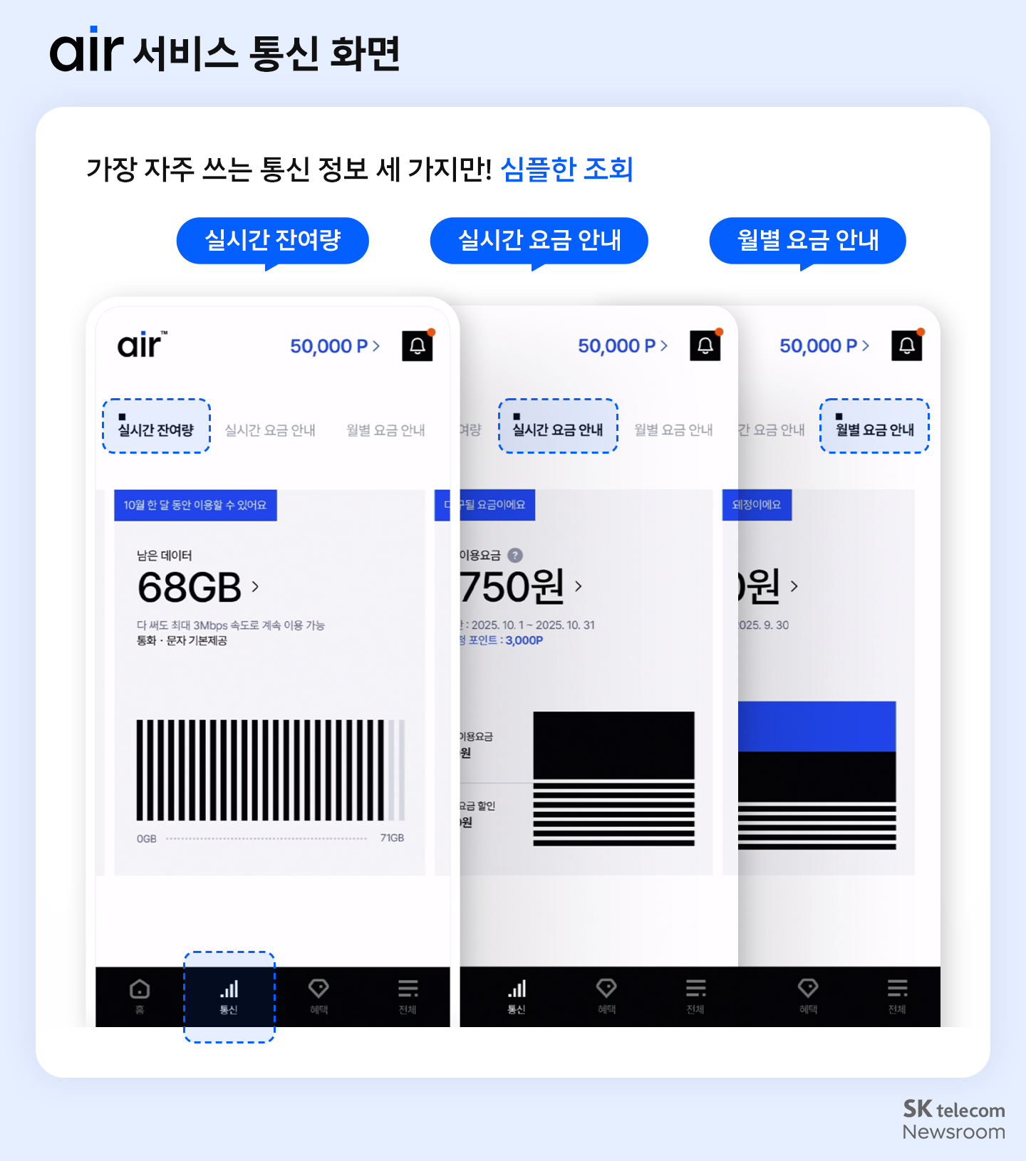 에어 앱은 ‘홈’, ‘통신’, ‘혜택’으로 구성되어 있다. 고객은 홈 화면에서 고객 맞춤형 메시지부터 혜택 정보, 요금제 가입 등을 직관적으로 한눈에 확인할 수 있다.