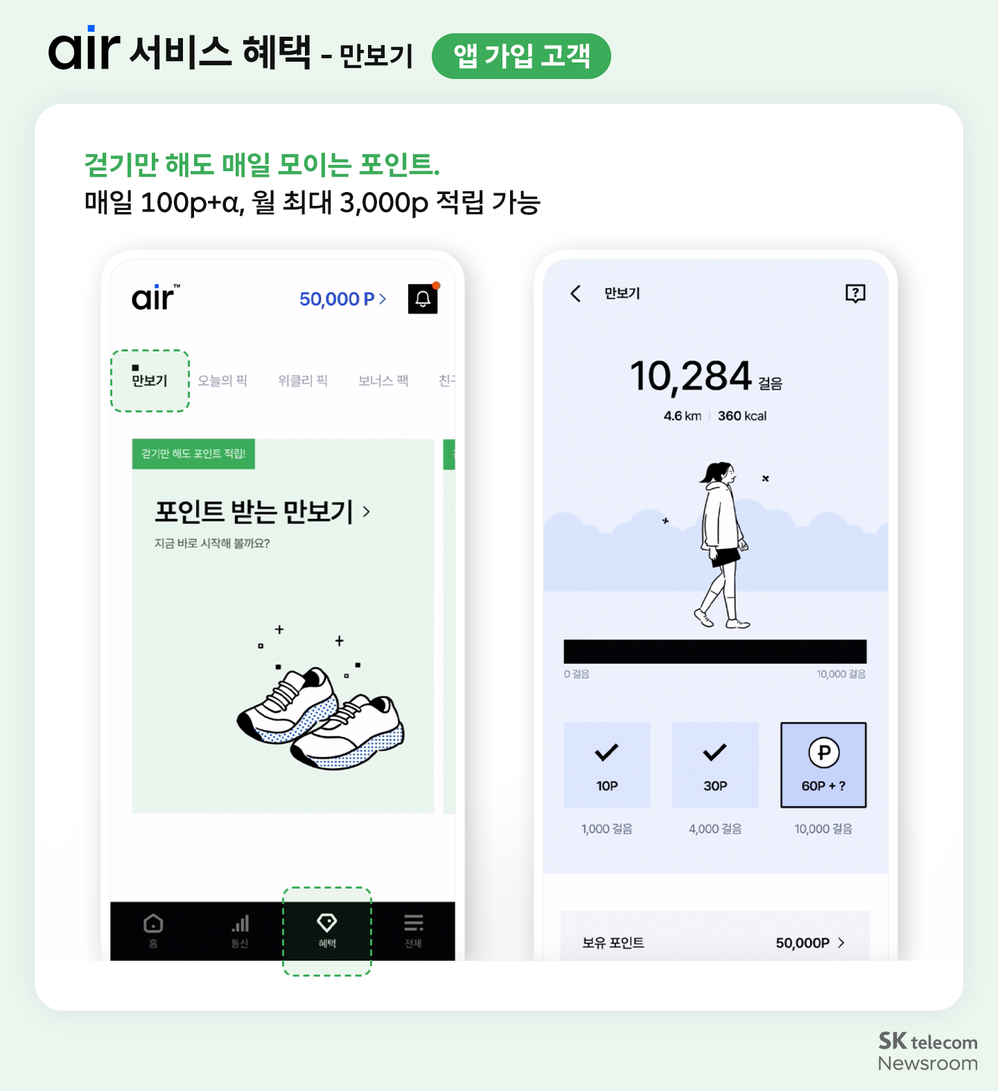 에어 요금제별 매달 보너스 포인트를 주는 ‘보너스팩’, 걸을수록 포인트가 쌓이는 ‘만보기’, 밸런스 게임에 참여하고 포인트를 받는 ‘오늘의 픽’, ‘위클리 픽’ 등이 준비되어 있다. 이외에도 ‘친구 초대’ 등 포인트를 적립할 수 있는 혜택이 다양하다. 보너스팩은 회선 고객 전용이나 만보기 등 나머지 혜택은 회원 가입만 하면 적립할 수 있다. 포인트 사용은 회선 가입 후 가능하다.