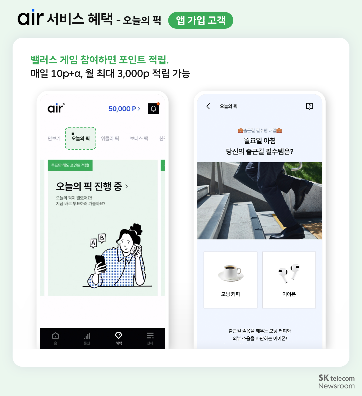 고객들의 가장 높은 호응이 기대되는 기능이 ‘에어 포인트’다. SKT는 기존의 T 서비스와는 완전히 다른 에어만의 특별한 혜택인 포인트 프로그램을 설계했다. 고객은 에어 앱에서 매일 다양한 미션을 수행하고, 쌓은 포인트를 모바일 상품권 구매와 요금 납부에 이용할 수 있다. 자주 방문하고, 활동하면 더 혜택이 쌓인다.