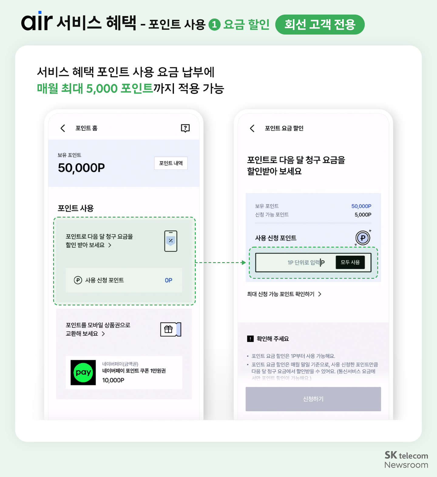 이렇게 차곡차곡 모은 포인트는 요금 납부에 사용할 수 있어 에어는 매우 실속있는 서비스다. 최대 5,000 포인트를 다음달 요금 청구 할인에 이용할 수 있다.