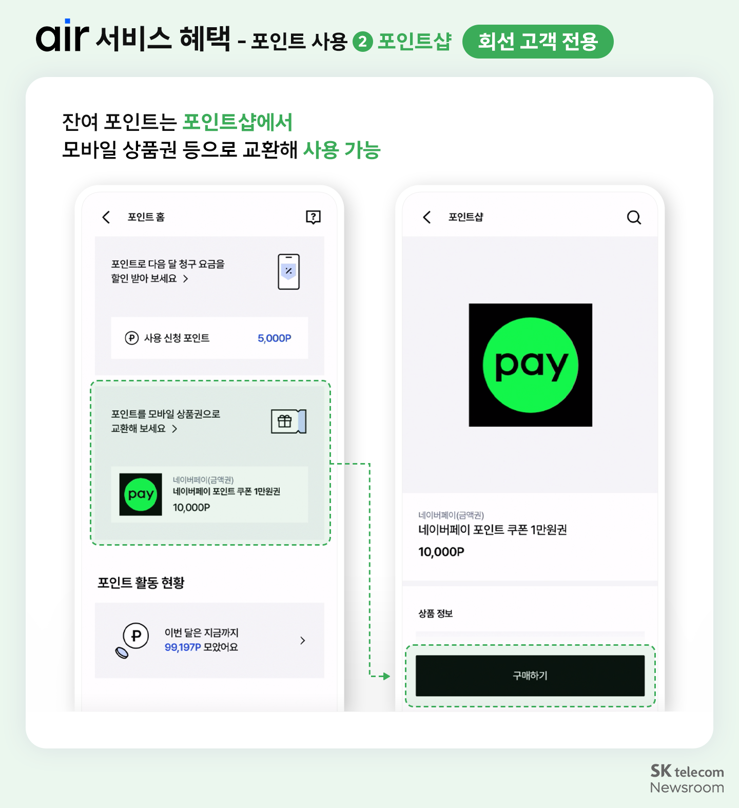 요금 납부하고 남은 포인트는 포인트샵회선 가입 d+31일부터 구매 가능에서 모바일 상품권 등으로 교환해 사용 가능하다. 네이버페이 포인트, 편의점/백화점/올리브영을 비롯해 쇼핑, 외식 등 다양한 업종에서 1천여 종의 인기 상품으로 구성되어 활용도가 높다. 회선 가입 한 달 후부터 포인트로 모바일 상품권을 교환할 수 있다.