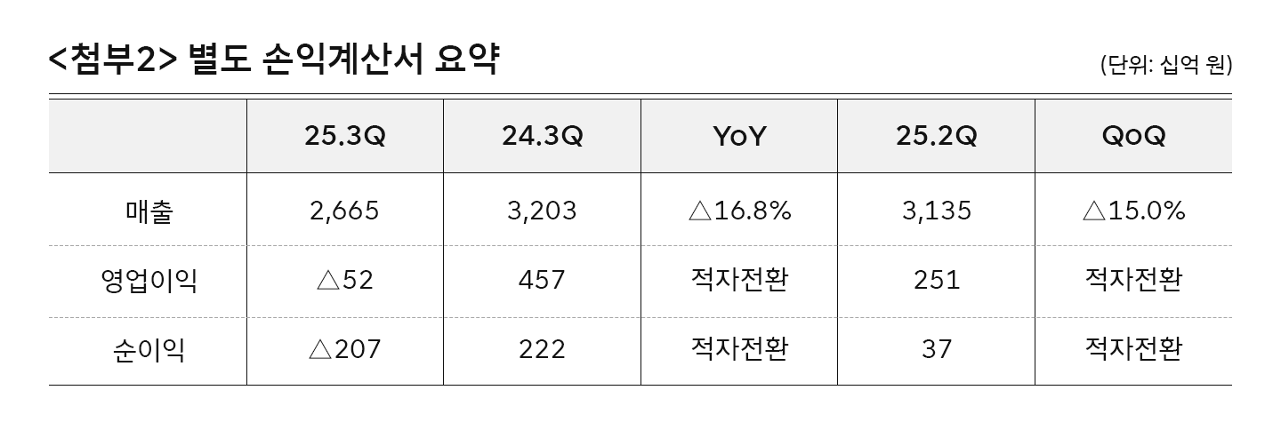 3분기에는 ‘고객 감사 패키지’ 시행 등의 영향으로, 매출은 전년 동기 12.2% 감소했으며 영업이익은 90.9% 감소했다. 별도 기준 매출은 2조6,647억 원, 영업손실 522억 원, 당기순손실 2,066억 원으로 집계됐다.