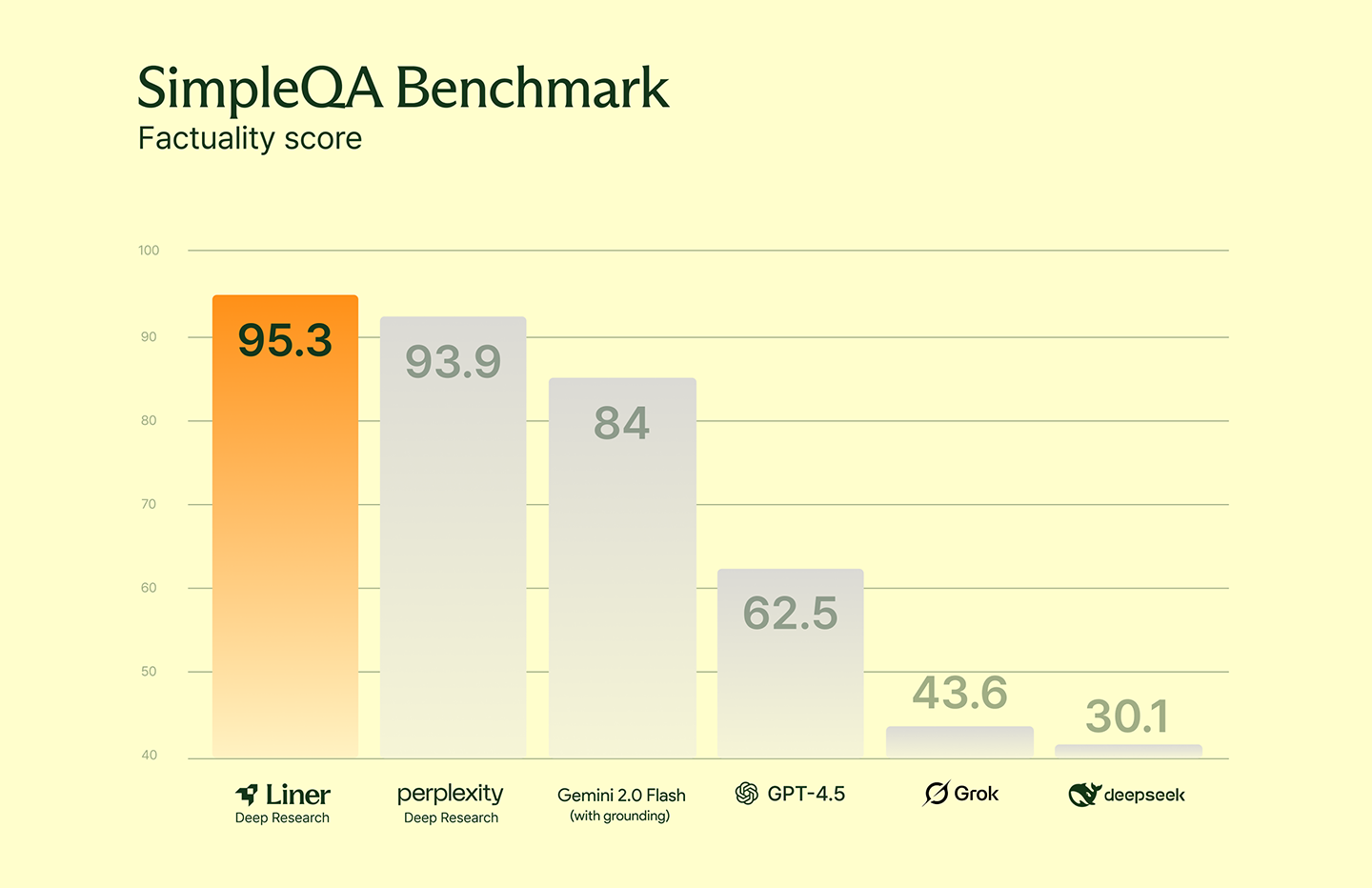 라이너 서비스는 SimpleQA 벤치마크에서 95.3점을 기록