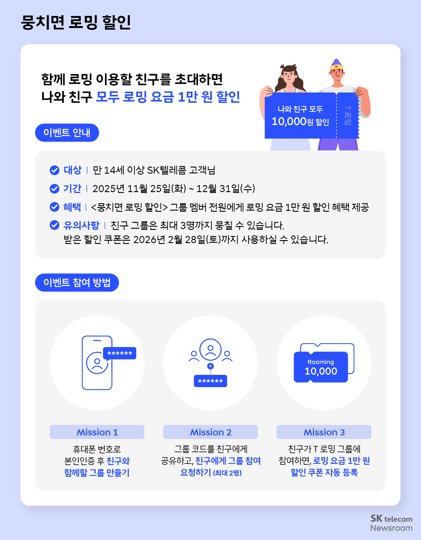 친구 또는 지인들과 함께 해외여행을 계획 중이라면 ‘뭉치면 로밍 할인’ 프로모션 혜택을 추천한다. 나 포함 최대 3명까지 그룹을 만들면 나와 친구 모두 로밍 요금 1만원 할인 쿠폰을 받을 수 있다. 12월 31일까지 이벤트가 진행된다. 받은 할인 쿠폰은 2026년 2월 28일까지 사용할 수 있어, 설 명절 여행까지 이번 프로모션 혜택을 이용할 수 있다.