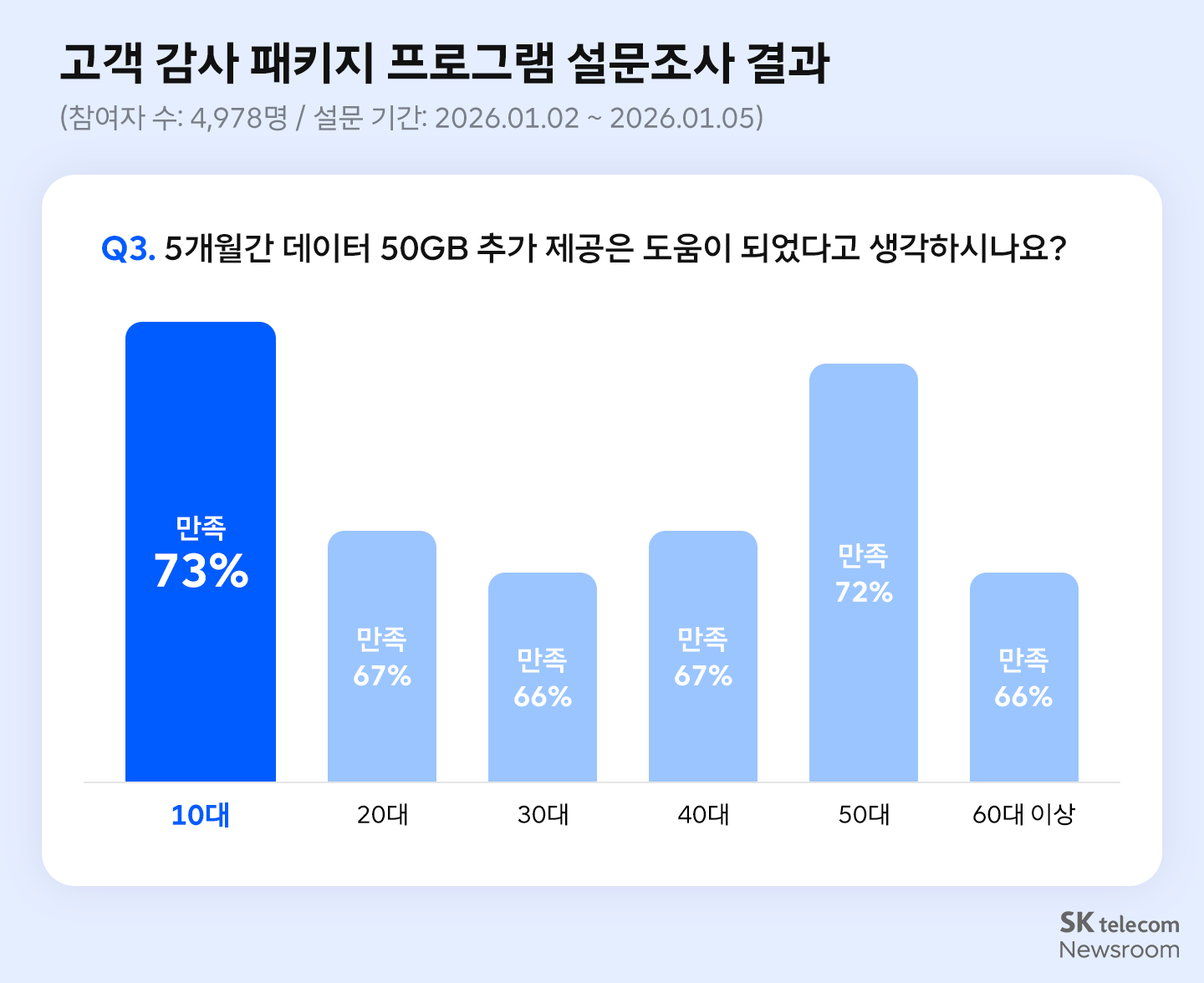 10대 고객의 73%가 추가 데이터 제공에 대해 ‘만족’ 또는 ‘매우 만족’한다는 응답을 함으로써 전 연령대(평균 68.7%)에서 가장 높은 만족을 보였다.