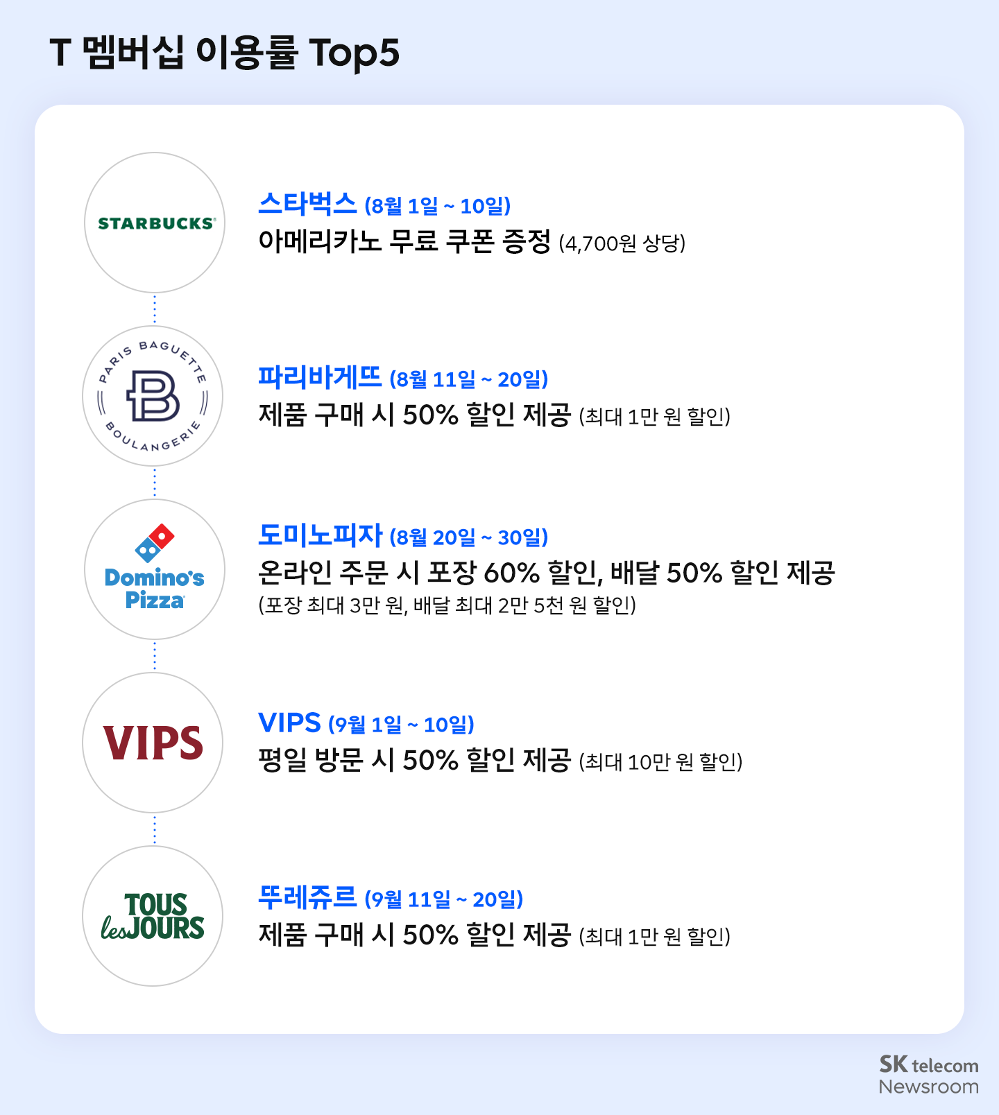 운영 기간 동안 제공된 T 멤버십 릴레이 할인 가운데, 고객 이용이 가장 많이 집중된 혜택은 스타벅스 아메리카노 무료 쿠폰 증정이었다. 이어 파리바게뜨와 뚜레쥬르의 제과·베이커리 제품 50% 할인 혜택, 도미노피자의 포장·배달 할인 혜택과 같이 일상 소비와 밀접한 영역을 중심으로 활발하게 활용됐다. 이 밖에도 고객들은 VIPS 평일 할인 등 외식·식음료 분야 제휴 혜택들을 선호했다.