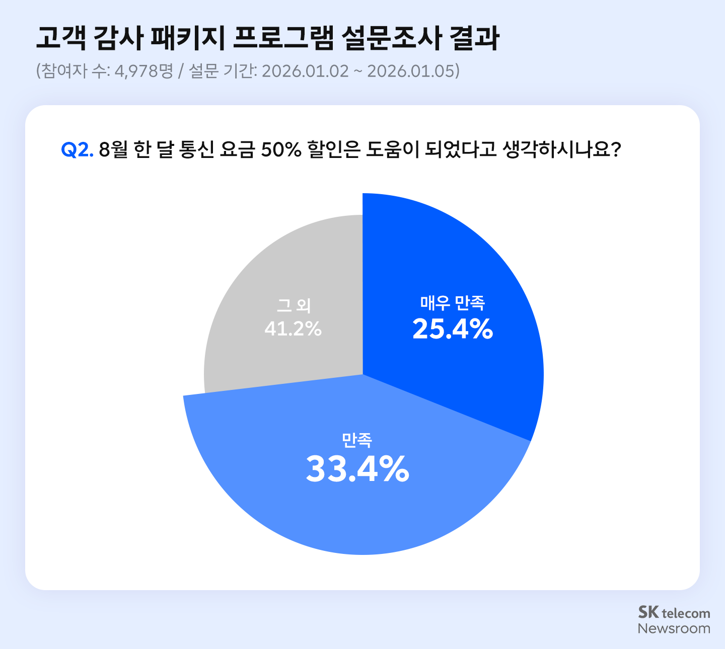그 결과 8월 한 달 50% 요금 할인(3,419명 선택, 68.7%)과 8월부터 12월까지 시행된 데이터 50GB 추가 제공(2,465명 선택, 49.5%)이 높은 만족도를 보였다.