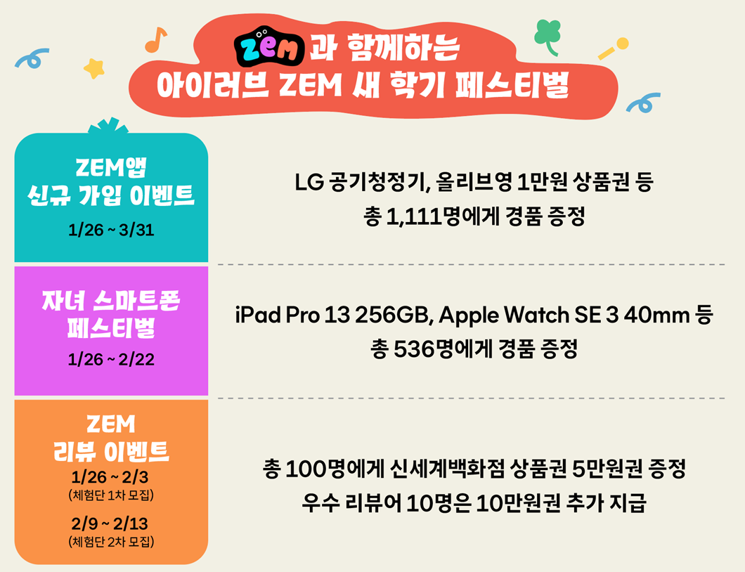 SK텔레콤(CEO 정재헌, news.sktelecom.com)은 2026년 새 학기를 앞둔 학생과 학부모 고객을 위한 다양한 혜택을 한데 모은 ‘아이러브 ZEM 새 학기 페스티벌’을 오늘(26일)부터 3월 31일까지 진행한다고 밝혔다.