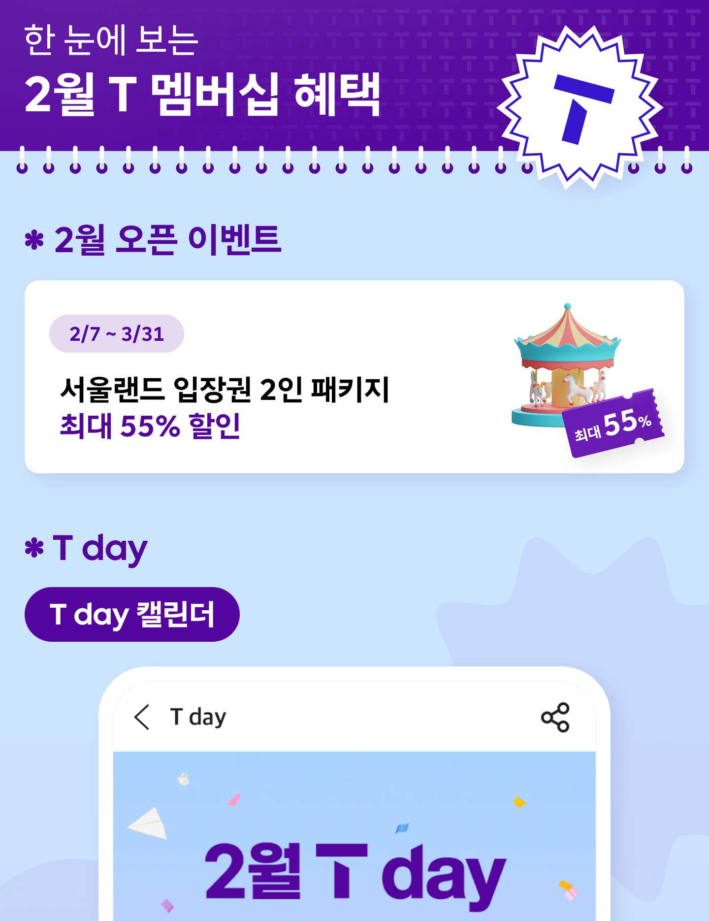SKT는 신학기를 맞아 가족 단위로 많이 방문할 수 있는 혜택을 포함해 T 멤버십 고객을 위한 다양한 제휴 브랜드 할인과 이벤트를 준비했다. 먼저, 2월 7일부터 3월 31일까지 서울랜드 입장권 2인 패키지를 최대 55% 할인된 가격으로 제공한다. 또한, 아쿠아필드 본인 및 동반 1인 입장권 최대 50% 할인과 키자니아 보호자(성인) 2명 무료 입장(반일권, 인기간식 및 50키조 추가 포함), 웅진 플레이도시 워터파크&온천스파 종일권 54% 할인을 T day Week(2/2~2/6) 혜택으로 즐길 수 있다.