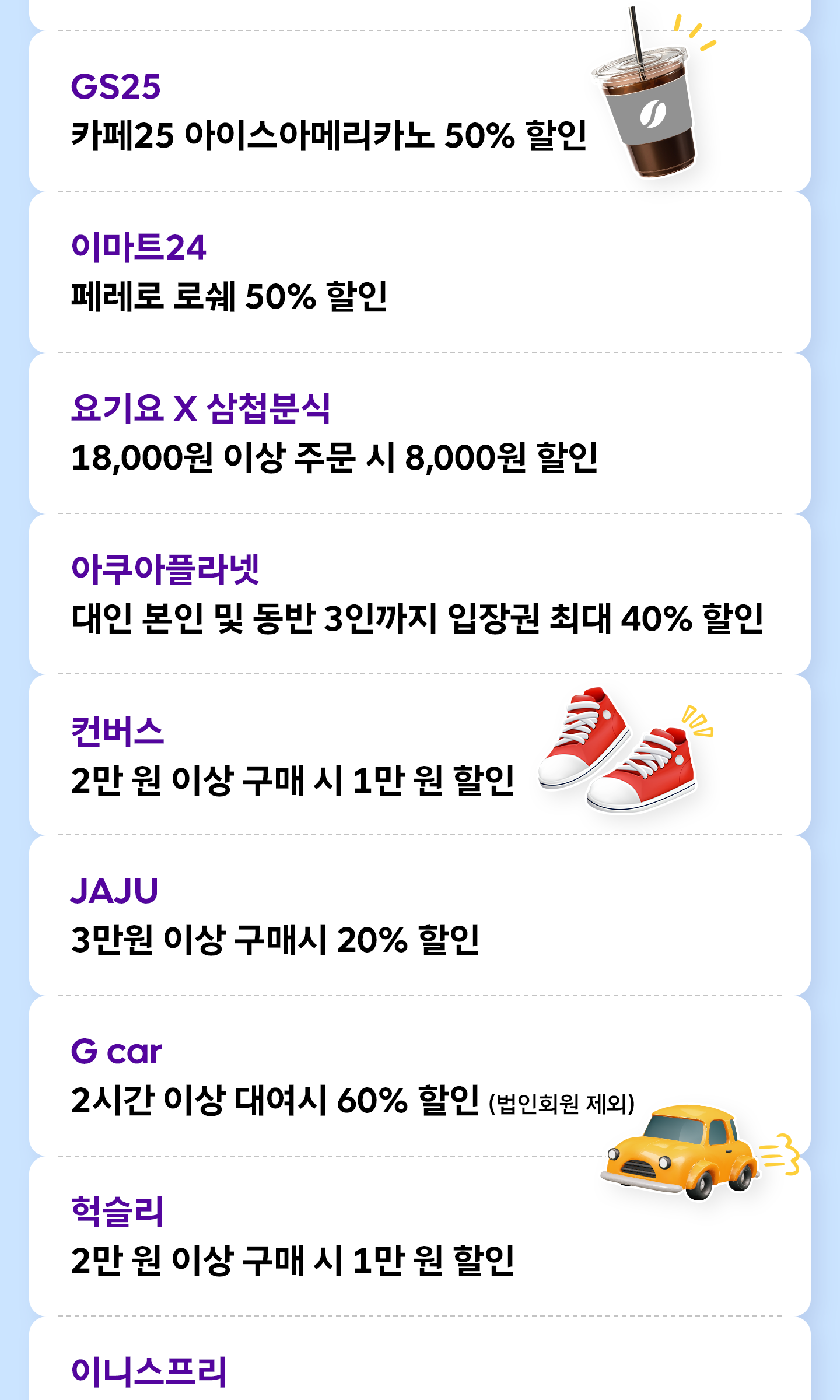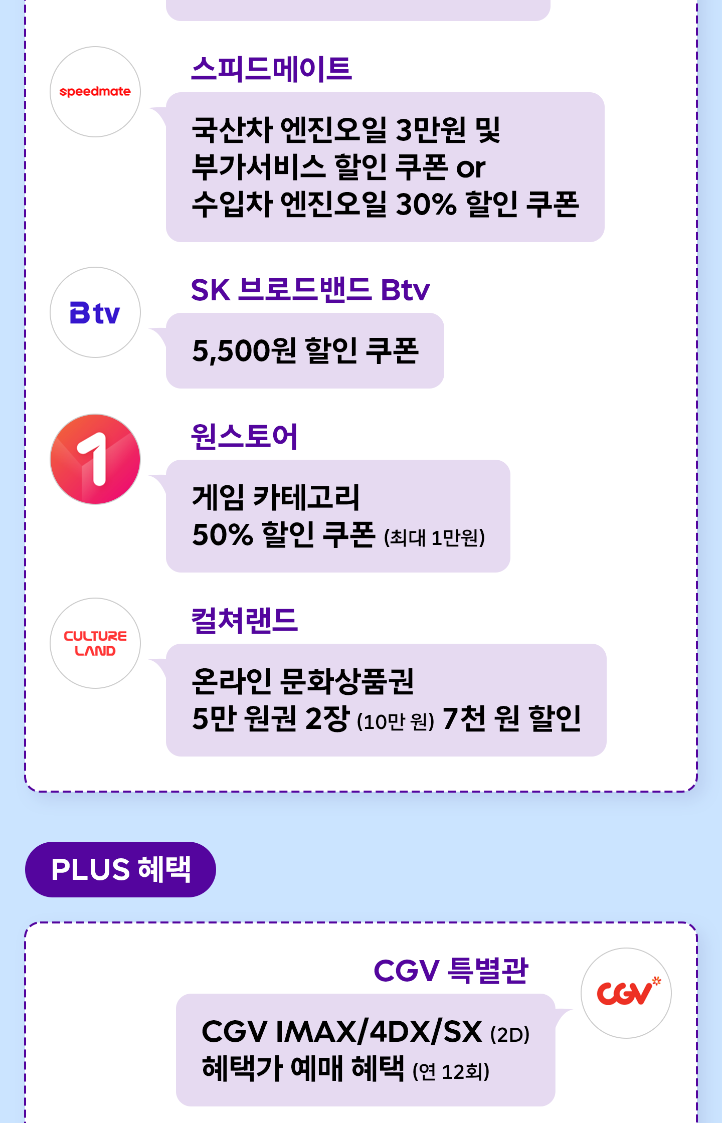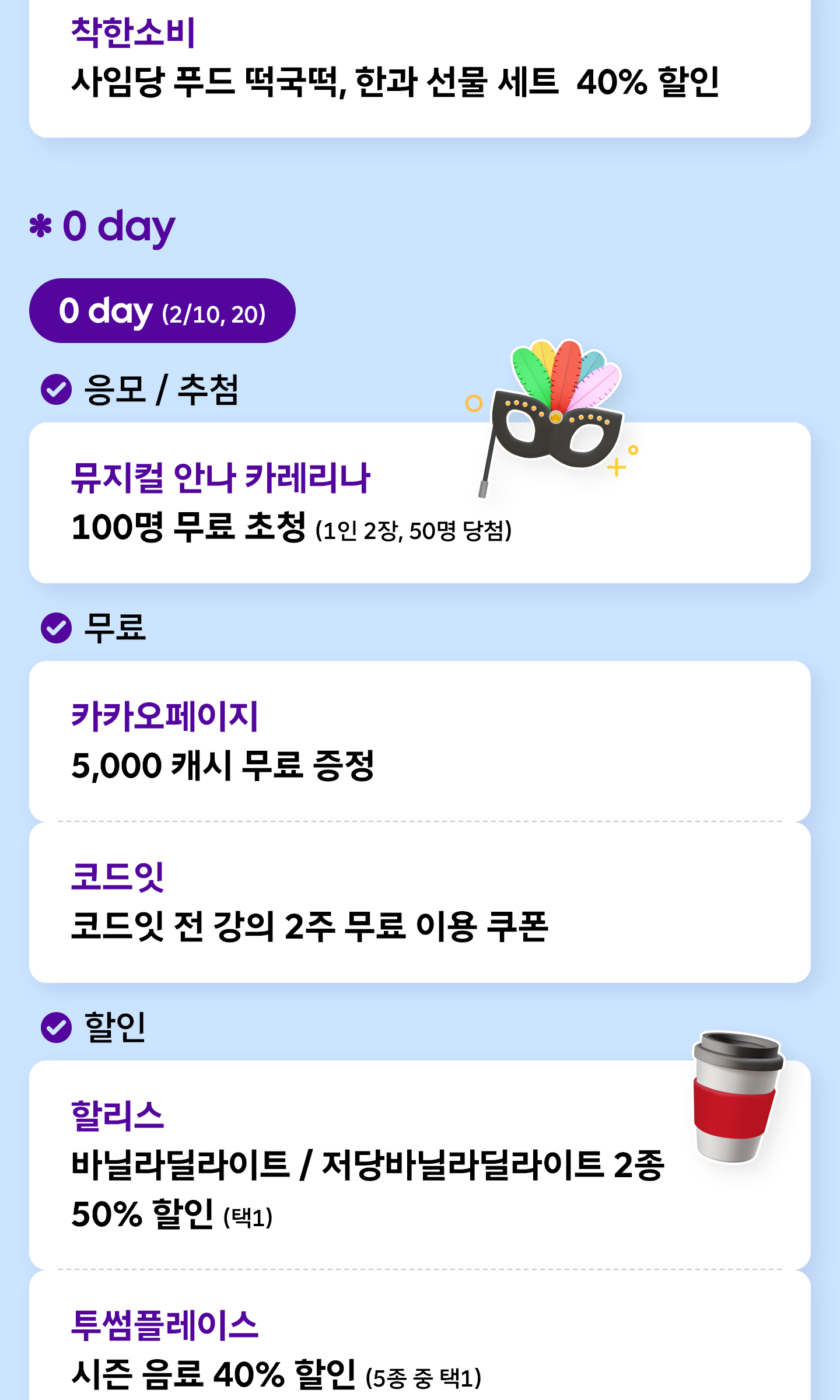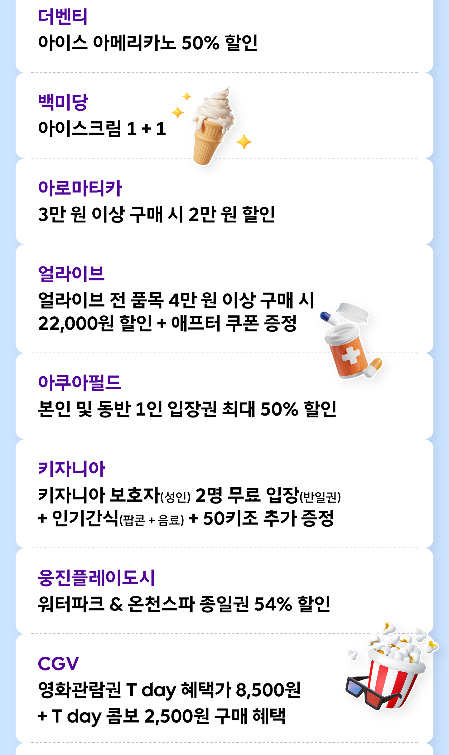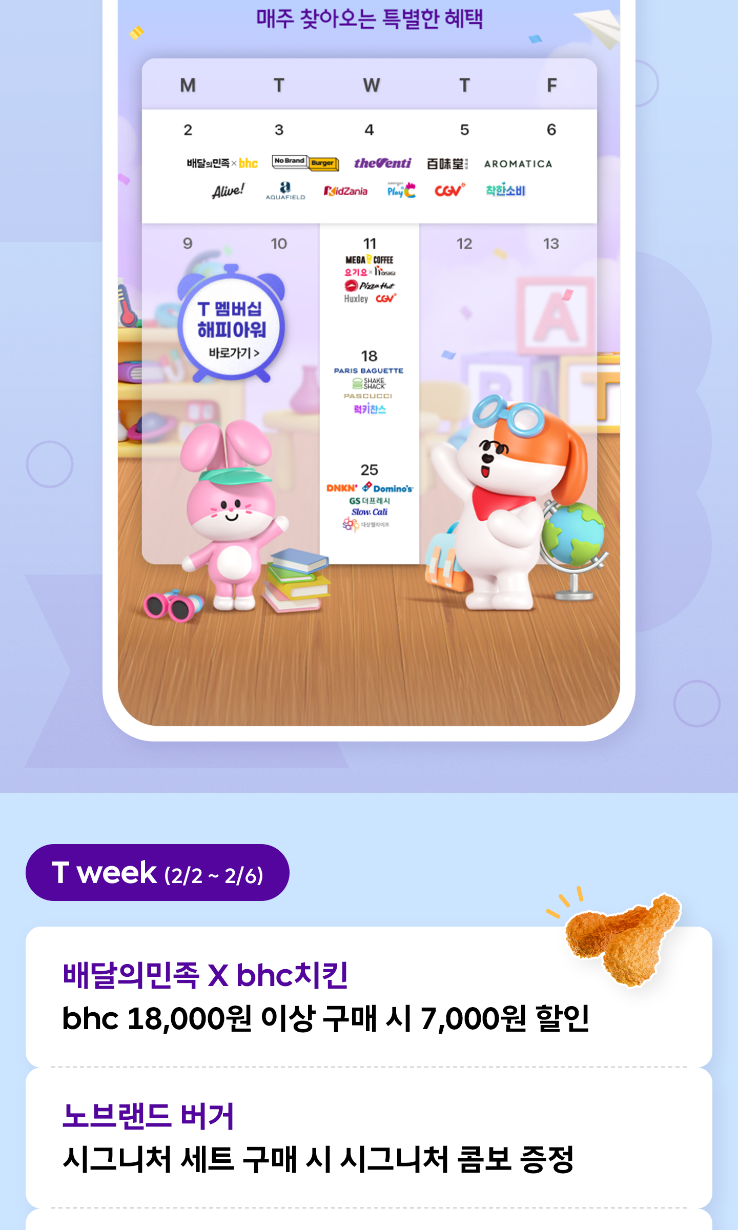 T day의 Week 혜택(2/2~2/6)에는 더벤티 아이스 아메리카노 50% 할인과 백미당 아이스크림 1+1 이벤트를 진행한다. 청년 고객을 위한 전용 프로그램인 0 day도 식음료 혜택이 풍성하다. 할리스 바닐라딜라이트/저당바닐라딜라이트 2종 50% 할인(택1), 투썸플레이스 시즌 음료 40% 할인(5종 중 택1), GS25 카페25 아이스 아메리카노 50% 할인을 진행한다.
