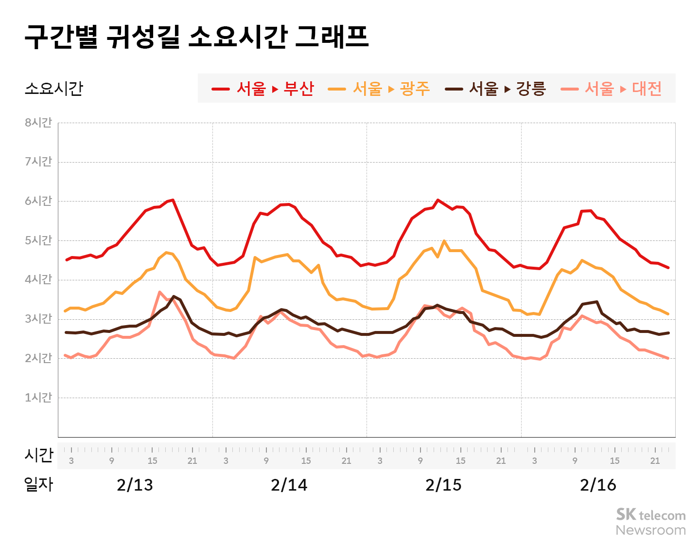 SKT 뉴스룸과 티맵모빌리티는 2,600만 명 이상이 사용하는 티맵(TMAP) 이용자 데이터를 바탕으로, 설 연휴 귀성·귀경길에 예상되는 주요 고속도로 혼잡 시간대와 흐름을 예측했다.